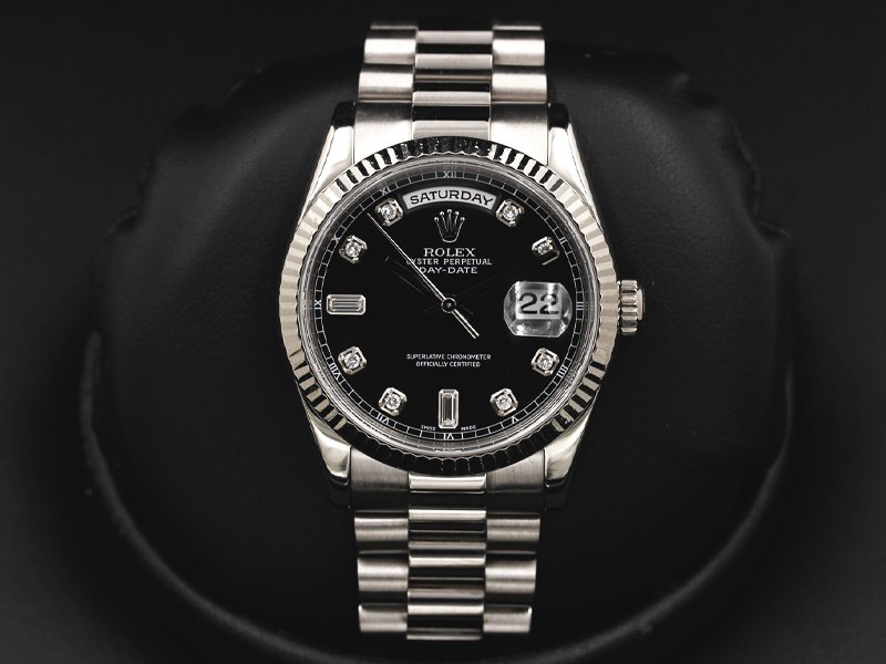 Референс 118239 Day-Date выполнен в не так часто встречающемся белом золоте и с циферблатом «Родий», а также с рифленым безелем и римскими цифрами в качестве часовых индексов. Модели из белого золота считаются менее «показушными», чем их сородичи из желтого драгоценного металла: они выглядят скромнее, но остаются весьма элегантными. Дополнительное внимание к часам призван притягивать рифленый безель, поскольку эта особенность заставляет его сверкать как бриллиант даже при слабом освещении. Даже сторонники «старой школы», отдающие предпочтение при прочих равных условиях золотым часам, признают, что подобные версии из белого золота тоже хороши.