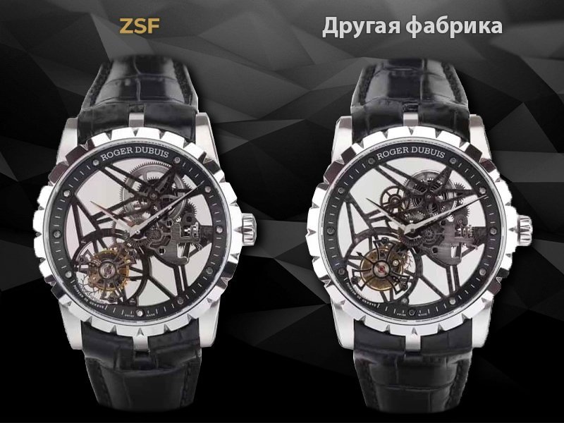 Следует отметить, что новая реплика – это не первая, но зато самая удачная попытка ZSF произвести идеальную копию одних из самых почитаемых скелетонизированных часов с турбийоном от Roger Dubuis. В предыдущей версии многие отмечали две существенные недоработки – отсутствие противовесов в механизме балансира и «лишние» зубчатые шестерёнки. В новой усовершенствованной модели оба этих недостатка успешно устранены. Ориентируясь на оригинальный механизм RD505SQ, и проведя тщательные исследовательские работы, мастера ZSF добились практически полной идентичности копии по внешнему виду, включая все зазоры между деталями. В результате соответствие копии оригиналу оценено в 98%. Более того, каждое изделие имеет свой идентификационный номер, что является крайне редким, если не единственным случаем на рынке часовых копий.