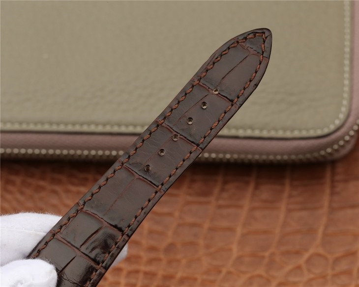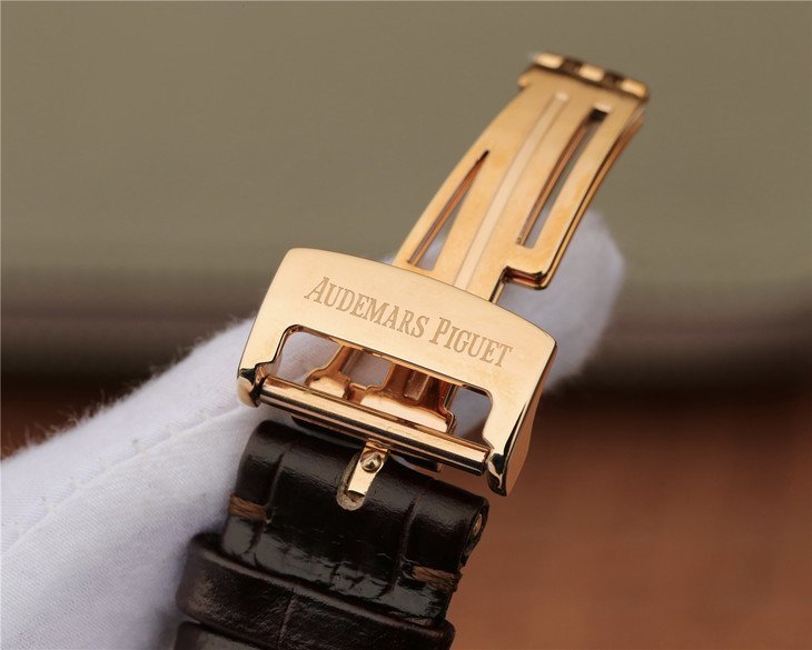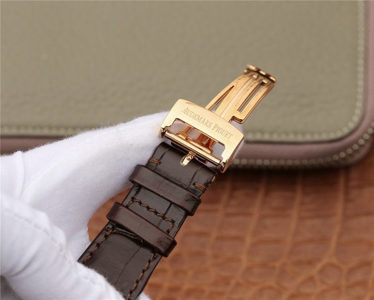 Коричневый (чёрный) кожаный ремешок, с двойной раскладывающейся позолоченной застежкой Audemars Piguet. |
