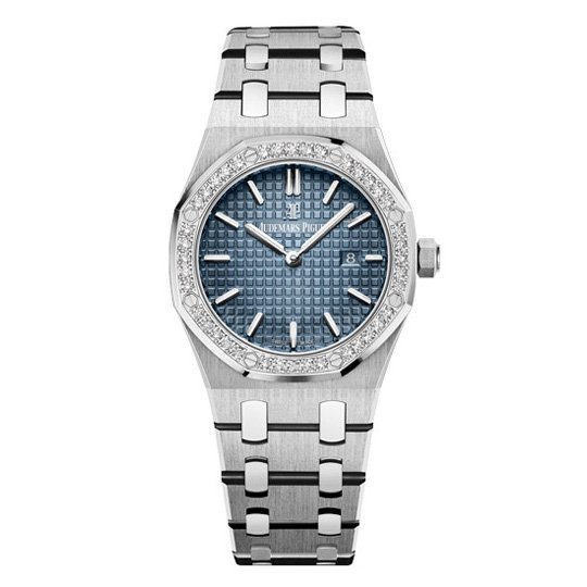 Синий, гильошированный (Mega Tapisserie). Часовые метки и стрелки Royal Oak, покрытые люминесцентным составом Super LumiNova С1 + С3. Окно даты, расположенное в отметке на 15.00 часов. |