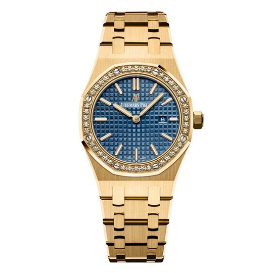 Синий, гильошированный (Mega Tapisserie). Позолоченные часовые метки и стрелки Royal Oak, покрытые люминесцентным составом Super LumiNova С1 + С3. Окно даты, расположенное в отметке на 15.00 часов. |