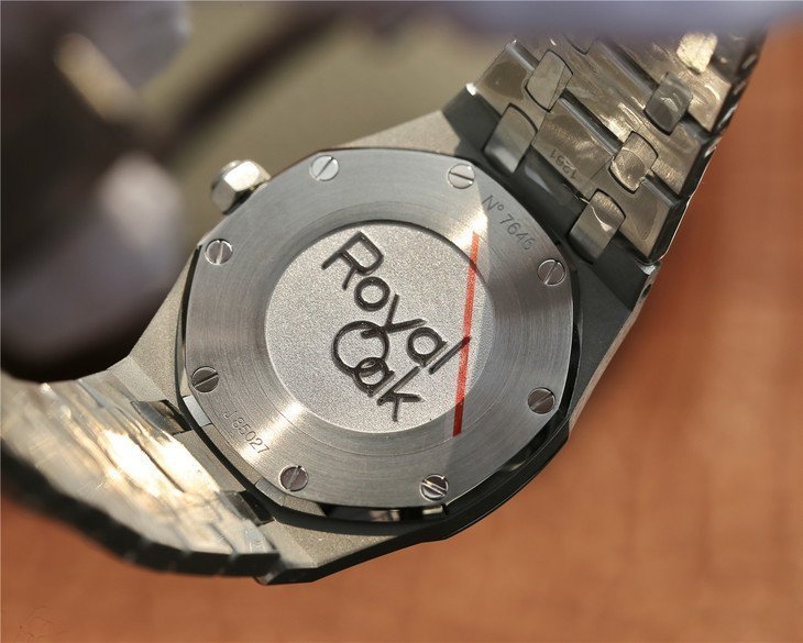 Посеребренный, гильошированный (Mega Tapisserie). Часовые метки и стрелки Royal Oak, покрытые люминесцентным составом Super LumiNova С1 + С3. Окно даты, расположенное в отметке на 15.00 часов. |
