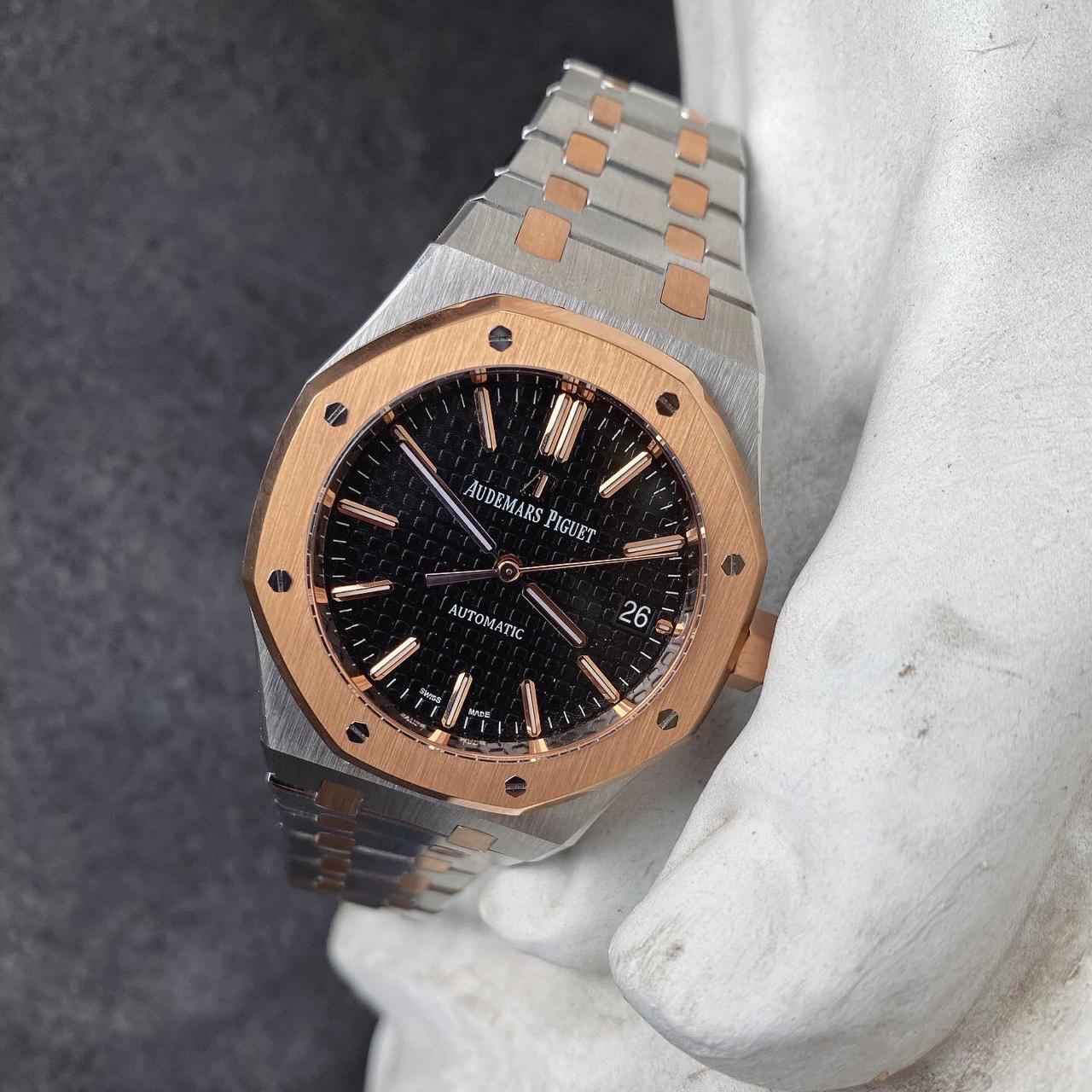 Черный, гильошированный (Mega Tapisserie). Позолоченные часовые риски и стрелки Royal Oak, покрытые люминесцентным составом Super LumiNova С1 + С3. Окно даты, расположенное в отметке на 15.00 часов. |
