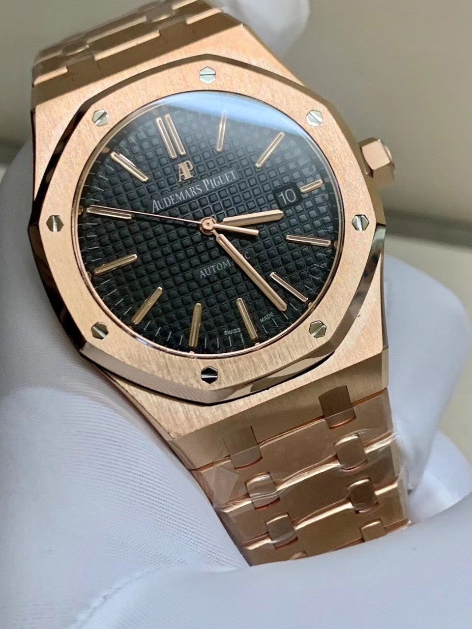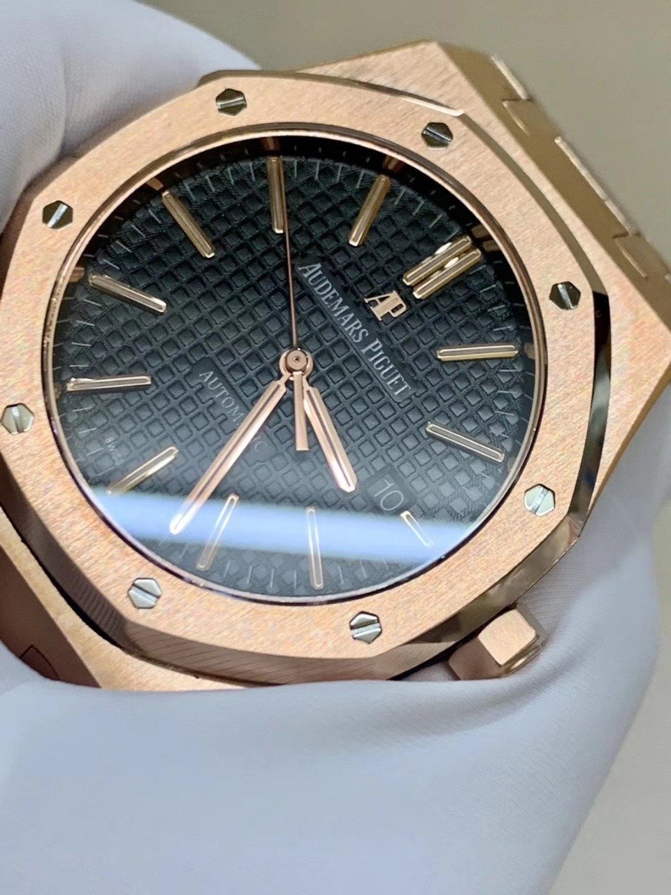Чёрный, гильошированный (Mega Tapisserie). Позолоченные часовые риски и стрелки Royal Oak, покрытые люминесцентным составом Super LumiNova С1 + С3. Окно даты, расположенное в отметке на 15.00 часов. |