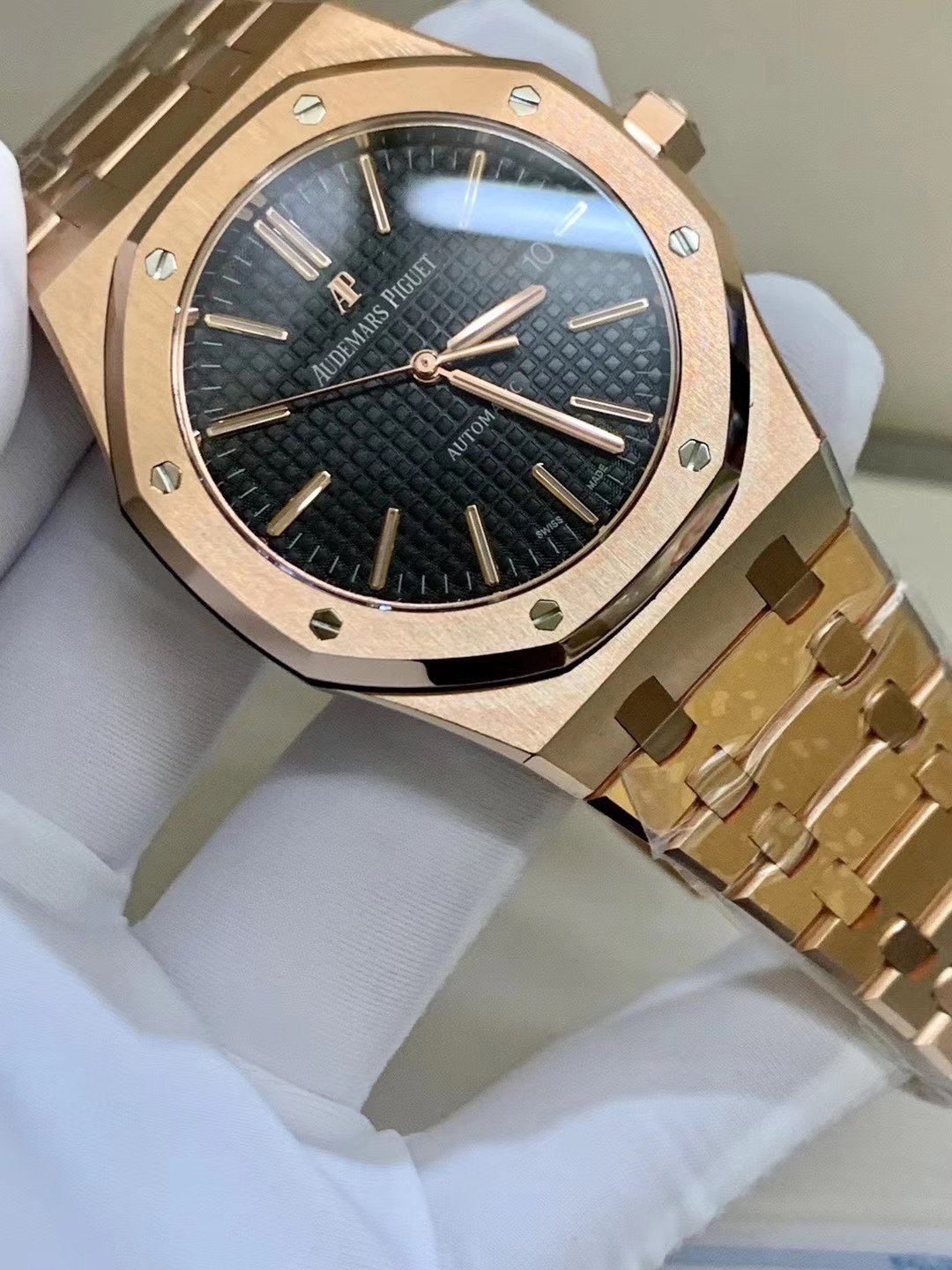 Чёрный, гильошированный (Mega Tapisserie). Позолоченные часовые риски и стрелки Royal Oak, покрытые люминесцентным составом Super LumiNova С1 + С3. Окно даты, расположенное в отметке на 15.00 часов. |