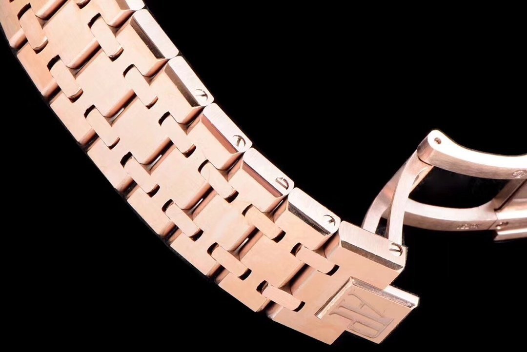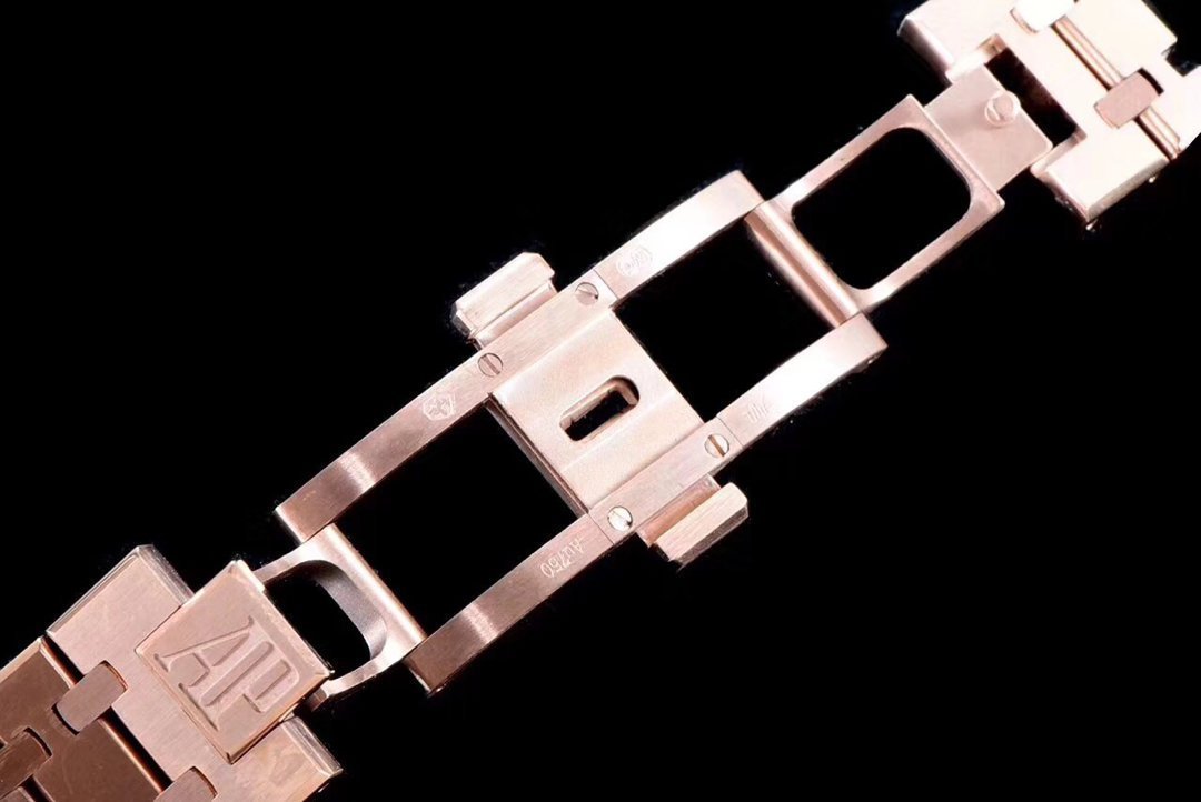 Стальной позолоченный браслет из сатинированной стали образца 2015 года, с двойной раскладывающейся застежкой Audemars Piguet. Либо синий кожаный ремешок. |