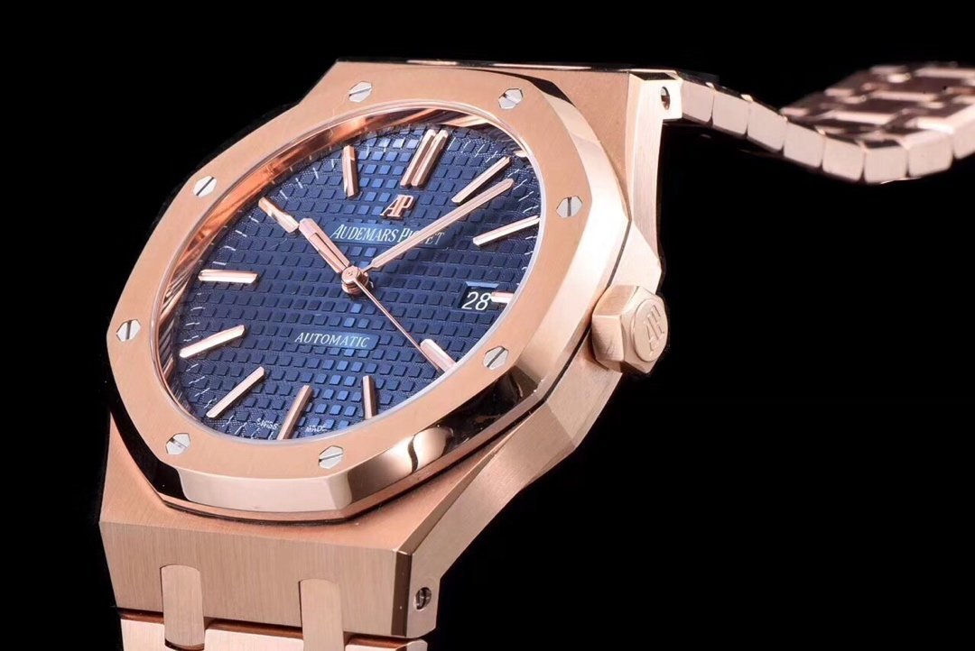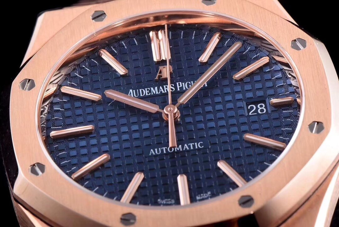 Синий, гильошированный (Mega Tapisserie). Позолоченные часовые риски и стрелки Royal Oak, покрытые люминесцентным составом Super LumiNova С1 + С3. Окно даты, расположенное в отметке на 15.00 часов. |