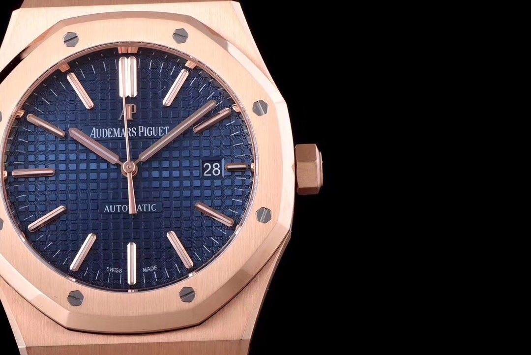 Синий, гильошированный (Mega Tapisserie). Позолоченные часовые риски и стрелки Royal Oak, покрытые люминесцентным составом Super LumiNova С1 + С3. Окно даты, расположенное в отметке на 15.00 часов. |