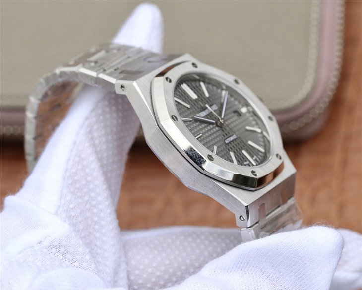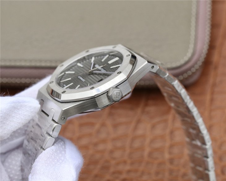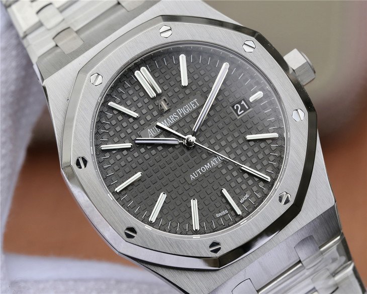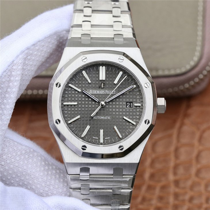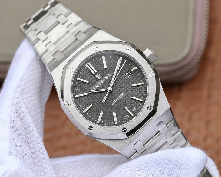 Серый, гильошированный (Mega Tapisserie). Часовые риски и стрелки Royal Oak, покрытые люминесцентным составом Super LumiNova С1 + С3. Окно даты, расположенное в отметке на 15.00 часов. |