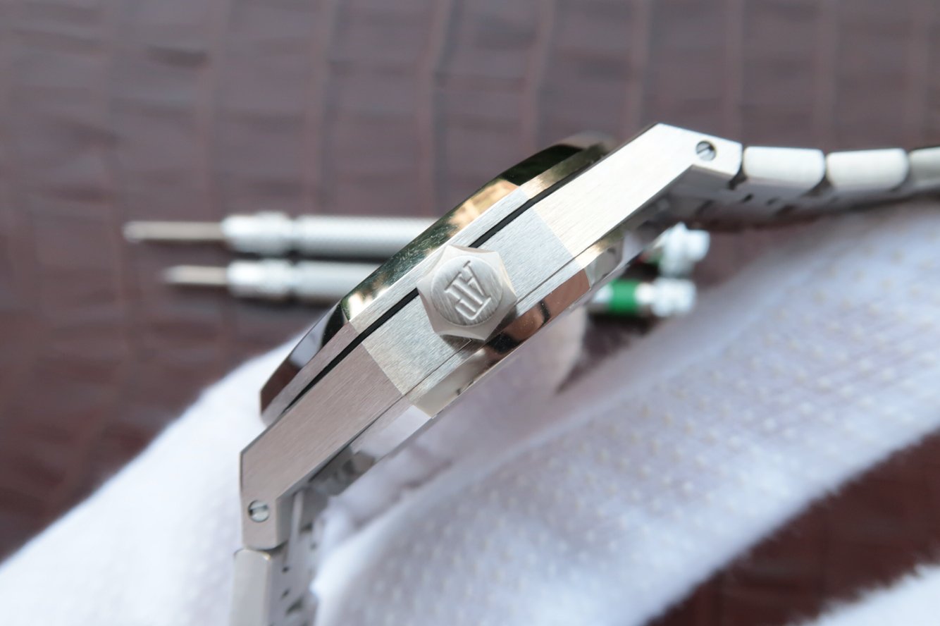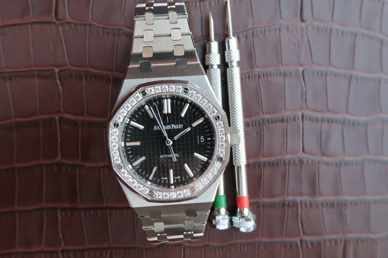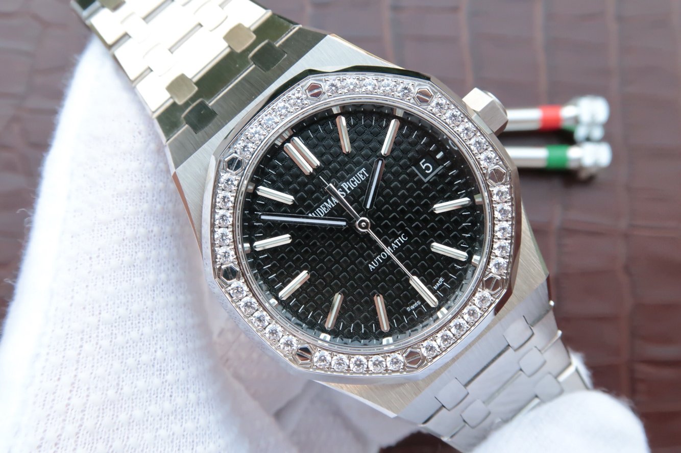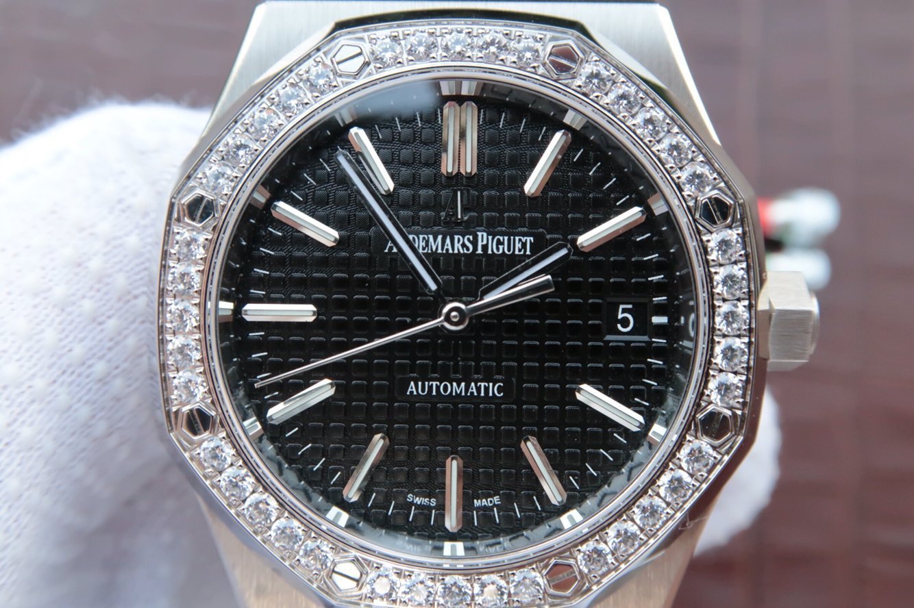 Чёрный, гильошированный (Mega Tapisserie). Часовые риски и стрелки Royal Oak, покрытые люминесцентным составом Super LumiNova С1 + С3. Окно даты, расположенное в отметке на 15.00 часов.