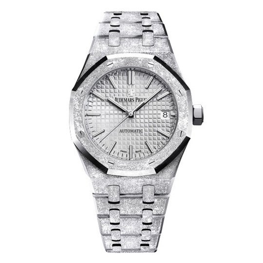 Серебристый, гильошированный (Mega Tapisserie). Часовые риски и стрелки Royal Oak, покрытые люминесцентным составом Super LumiNova С1 + С3. Окно даты, расположенное в отметке на 15.00 часов. |