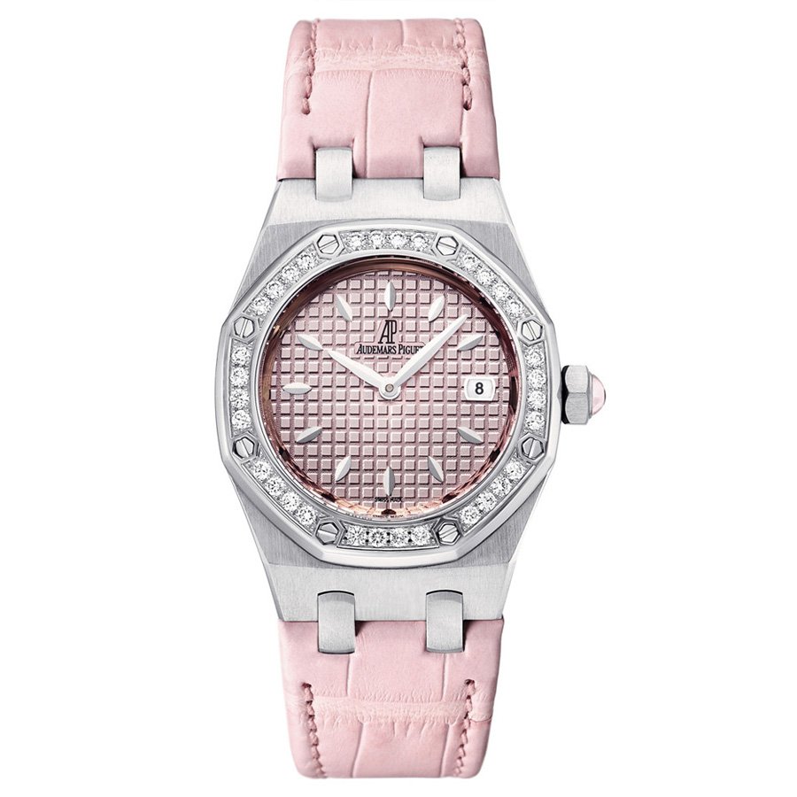 Розовый, гильошированный (Mega Tapisserie). Часовые метки и стрелки Royal Oak, покрытые люминесцентным составом Super LumiNova С1 + С3. Окно даты, расположенное в отметке на 15.00 часов. |