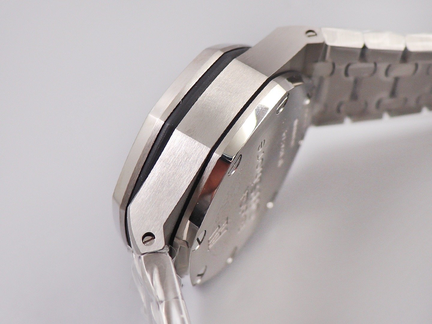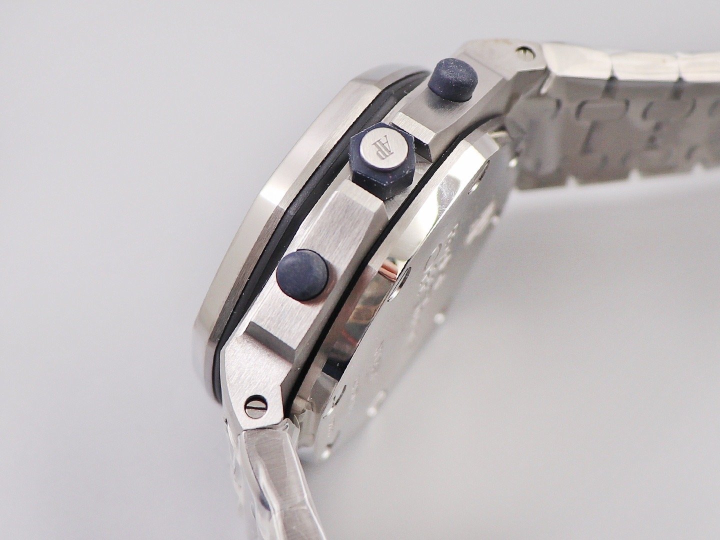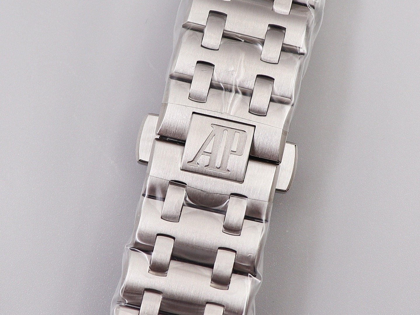 Посеребренный, гильошированный. Арабские часовые риски и стрелки Royal Oak; Малые циферблаты хронографа и циферблат малой секундной стрелки в отметке на 12.00 ч. Окно даты, в отметке на 15.00 часов под увеличительным окном "2,5". |