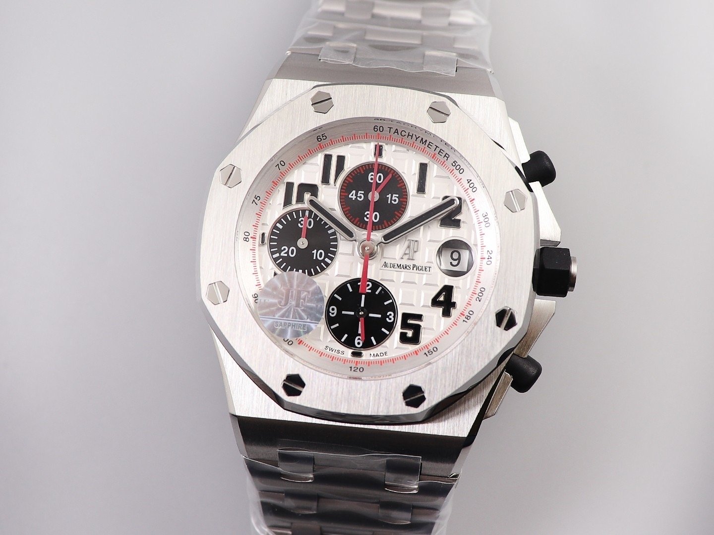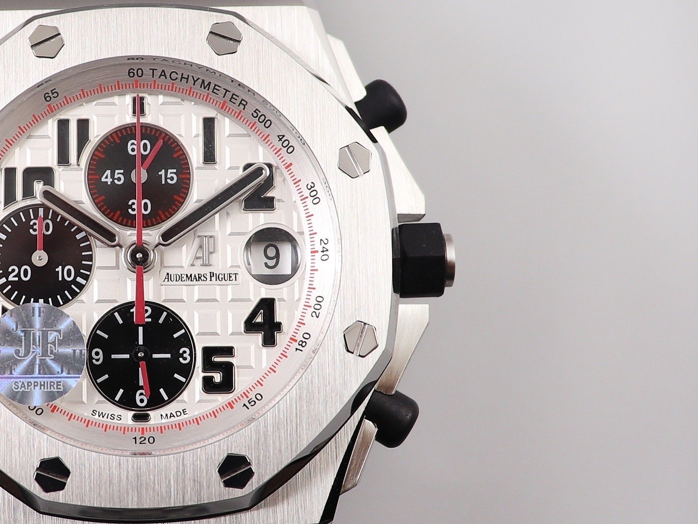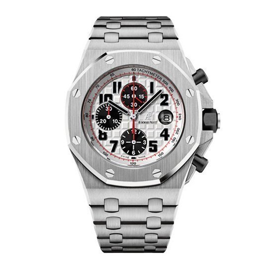 Посеребренный, гильошированный. Арабские часовые риски и стрелки Royal Oak; Малые циферблаты хронографа и циферблат малой секундной стрелки в отметке на 12.00 ч. Окно даты, в отметке на 15.00 часов под увеличительным окном "2,5". |