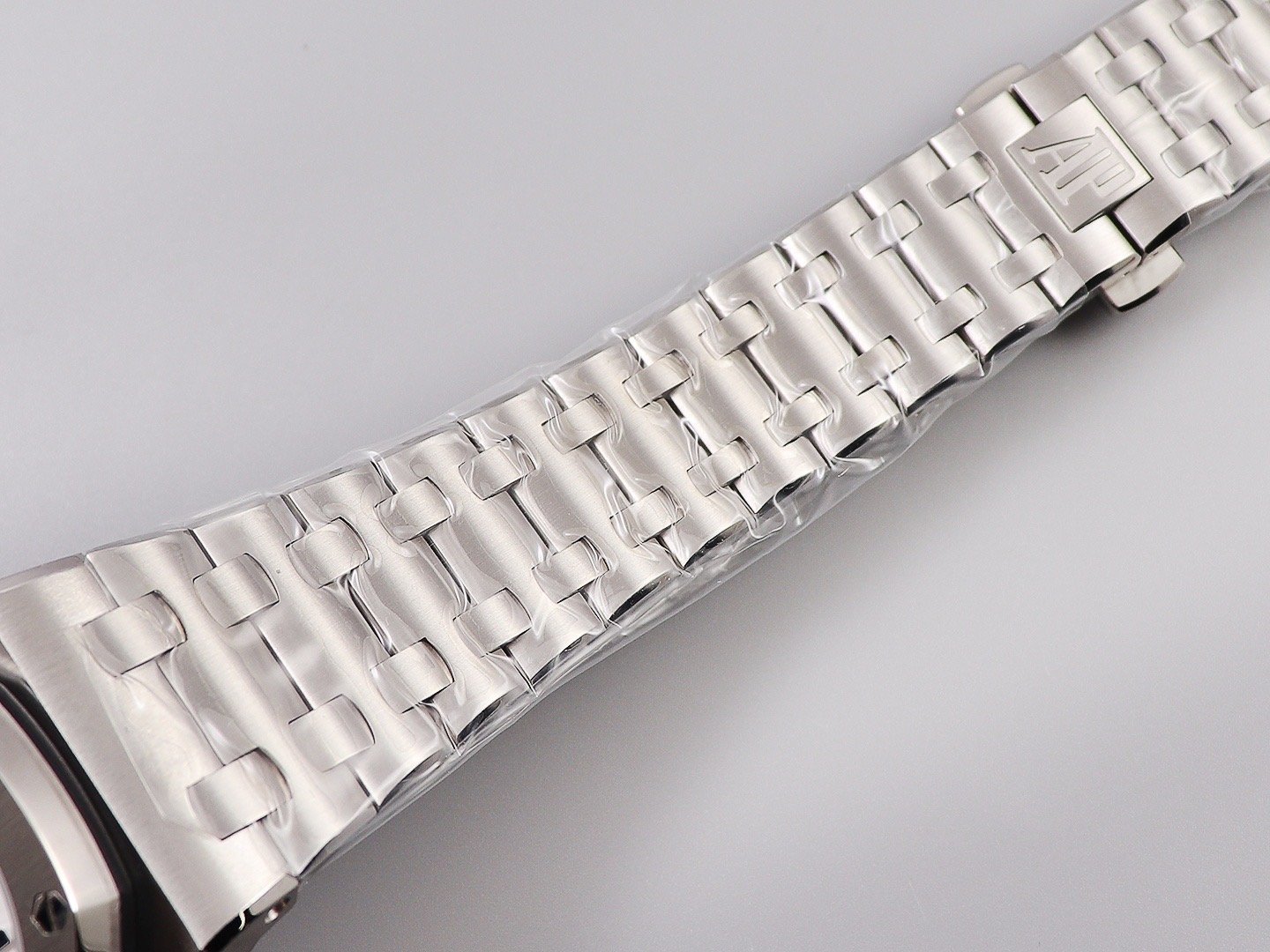Стальной браслет из сатинированной стали нового образца (браслет 2014 года), с двойной раскладывающейся застежкой Audemars Piguet. Либо черный кожаный ремешок из кожи крокодила. |