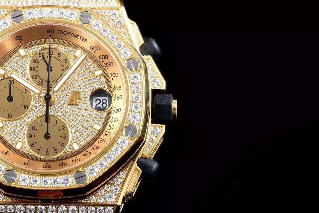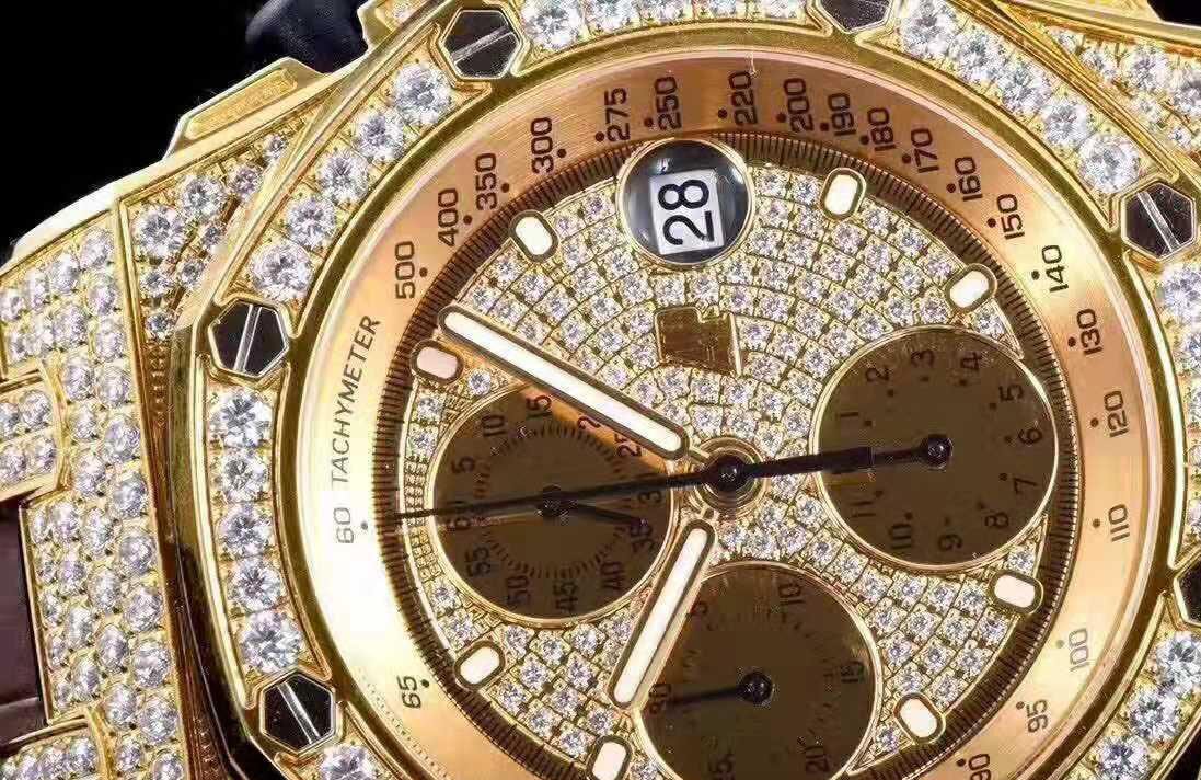 Черный, инкрустированный. Часовые риски и стрелки Royal Oak, покрытые люминесцентным составом SuperLumiNova С3. Циферблаты хронографа и циферблат малой секундной стрелки в отметке на 12.00 ч. Окно даты на 15.00 часов под увеличительным окном. |