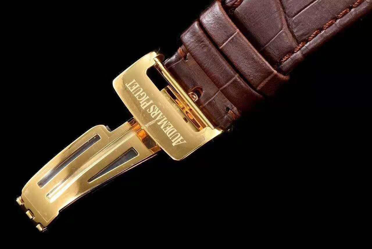 Коричневый кожаный ремешок, прошитый черными нитками, с двойной раскладывающейся позолоченной застежкой Audemars Piguet. |