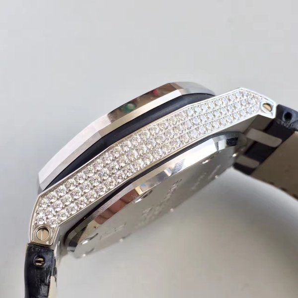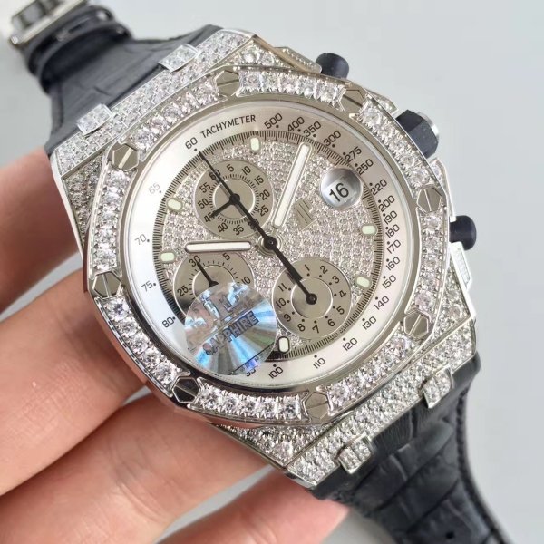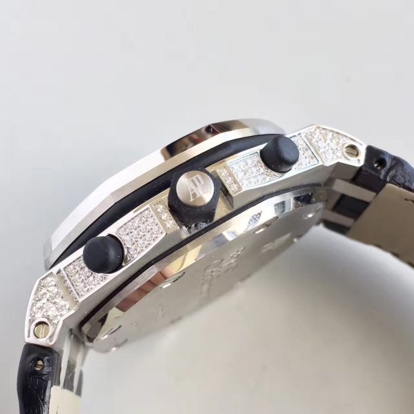 Посеребренный, инкрустированный. Часовые риски и стрелки Royal Oak, покрытые люминесцентным составом SuperLumiNova С3. Циферблаты хронографа и циферблат малой секундной стрелки в отметке на 12.00 ч. Окно даты на 15.00 часов под увеличительным окном. |