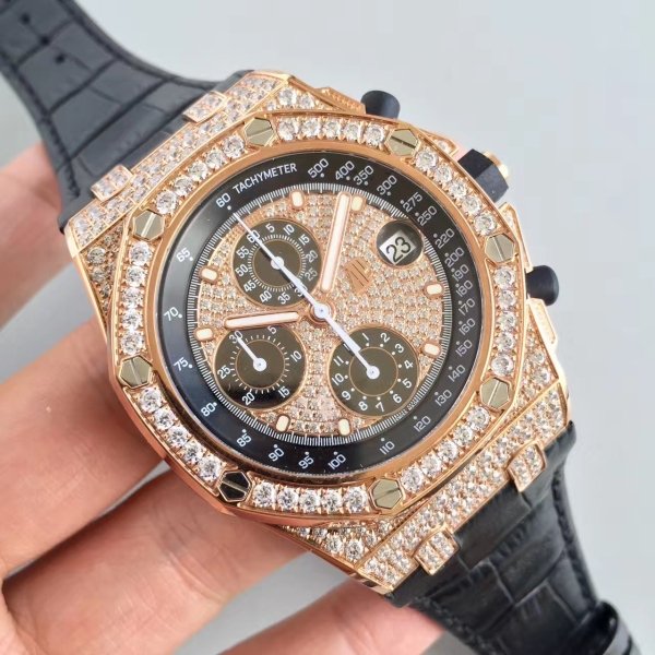Черный, инкрустированный. Часовые риски и стрелки Royal Oak, покрытые люминесцентным составом SuperLumiNova С3. Циферблаты хронографа и циферблат малой секундной стрелки в отметке на 12.00 ч. Окно даты на 15.00 часов под увеличительным окном. |