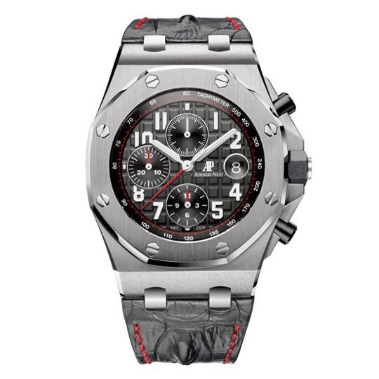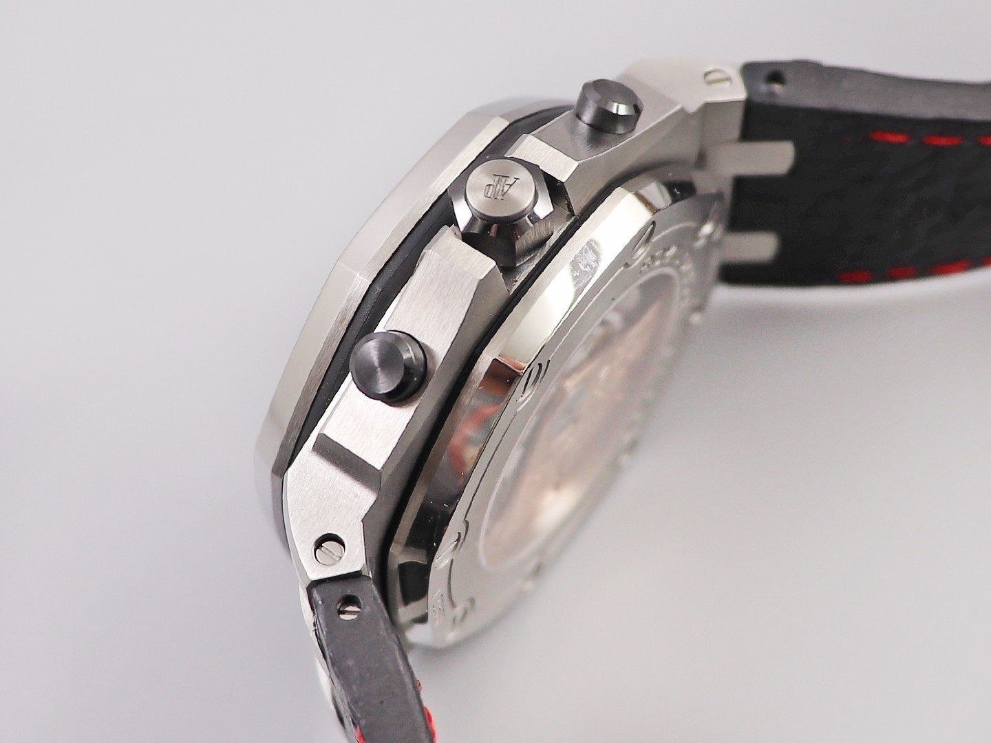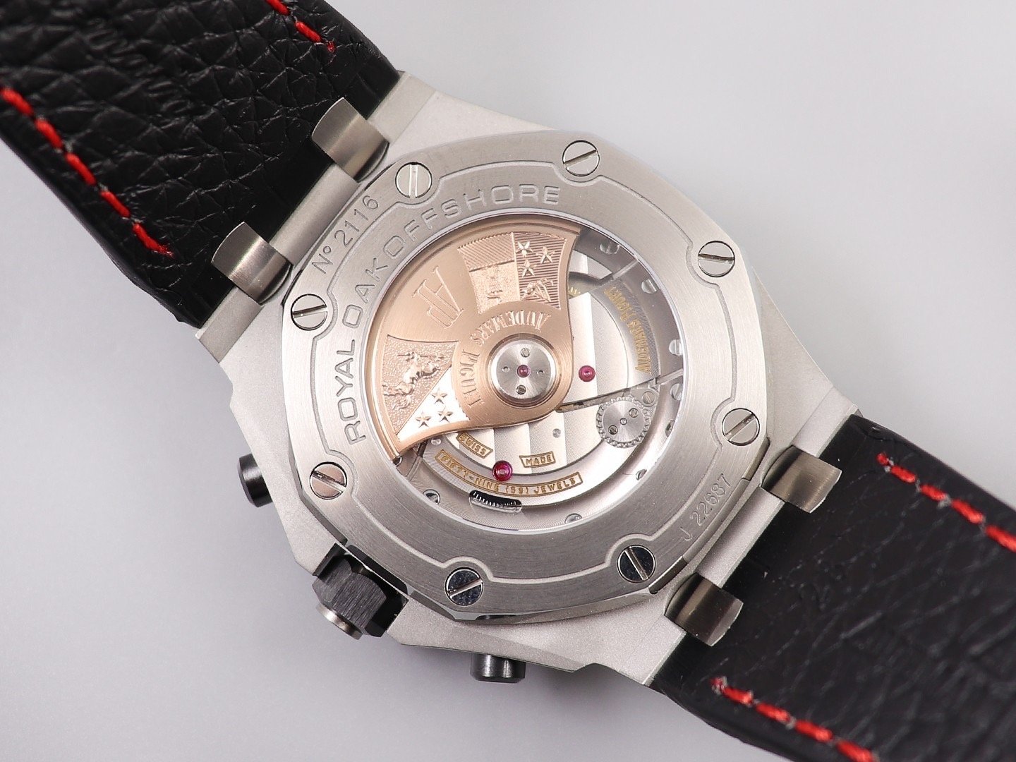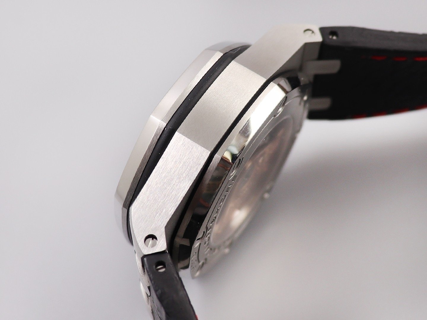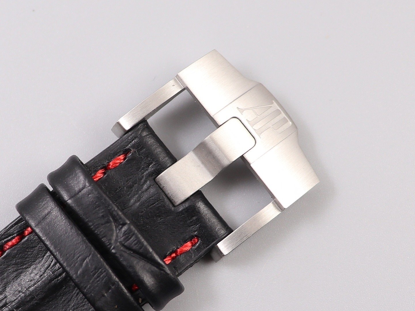 Черный кожаный ремешок, прошитый красными нитками, с простым (с помощью шипа) стальным сатинированным замком Audemars Piguet. Или черный каучуковый ремешок образца 2014 года. |