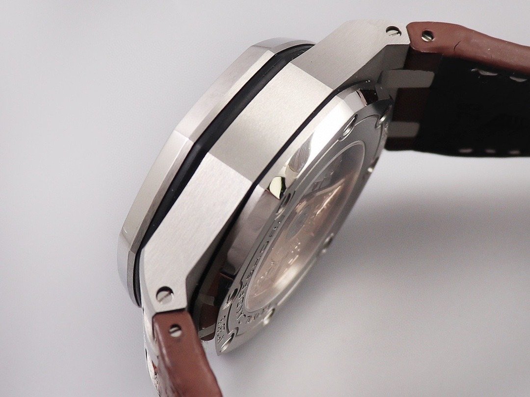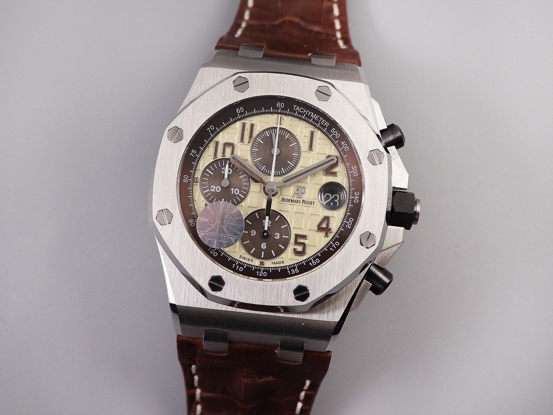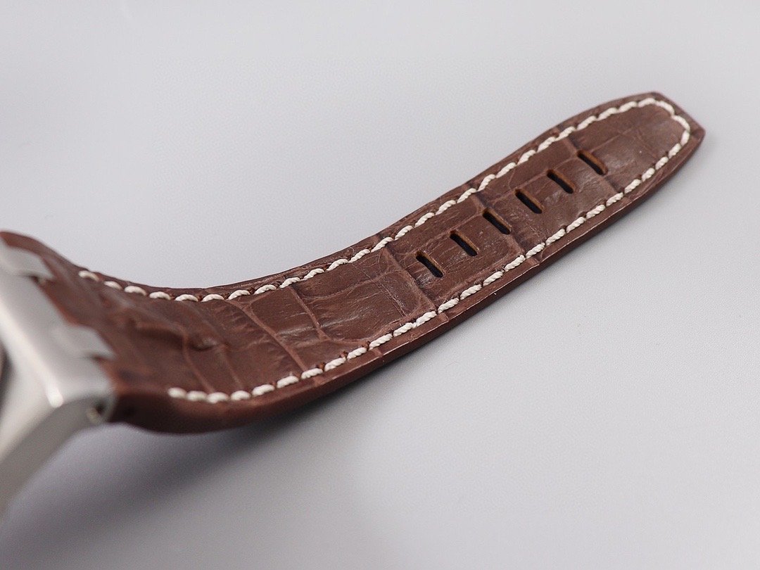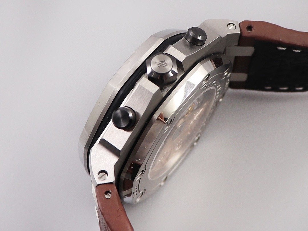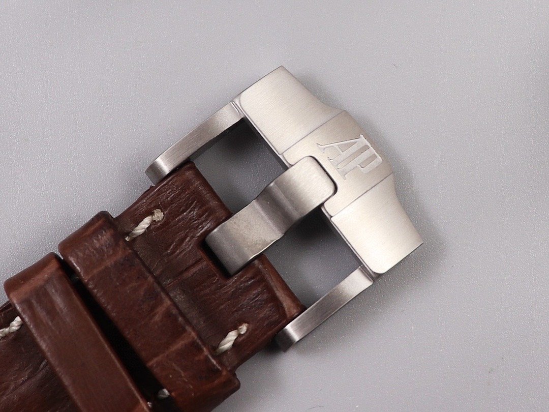 Коричневый кожаный ремешок, с простым (с помощью шипа) стальным замком Audemars Piguet. |