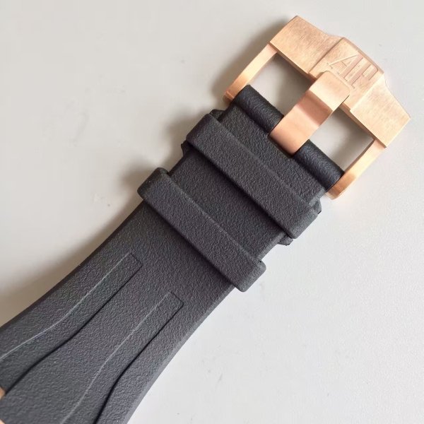 Черный каучуковый ремешок Royal Oak Offshore нового образца, с простым (с помощью шипа) позолоченным замком Audemars Piguet. |
