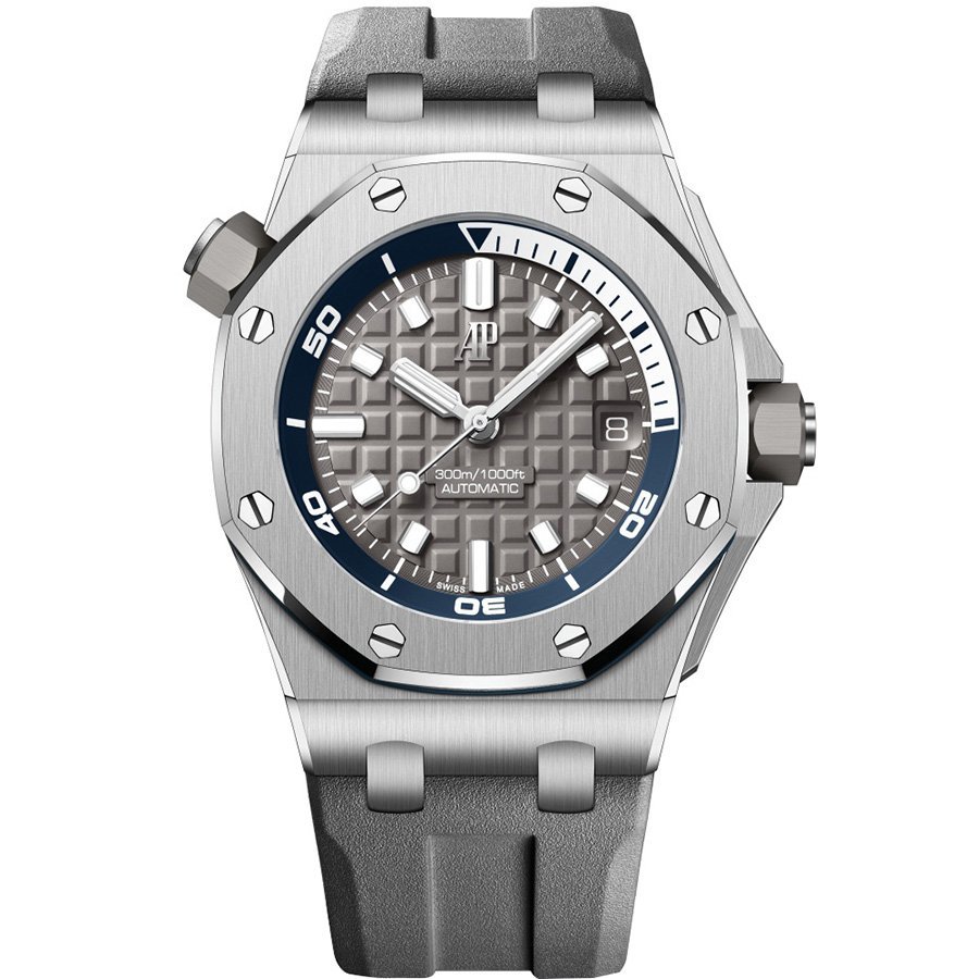 Серый, гильошированный (Mega Tapisserie). Часовые риски, дайверские метки на вращающемся внутреннем ранте и стрелки Royal Oak, покрытые люминесцентным составом Super LumiNova С1 + С3. Окно даты в отметке на 15.00 часов под увеличительным окном "2.5" |