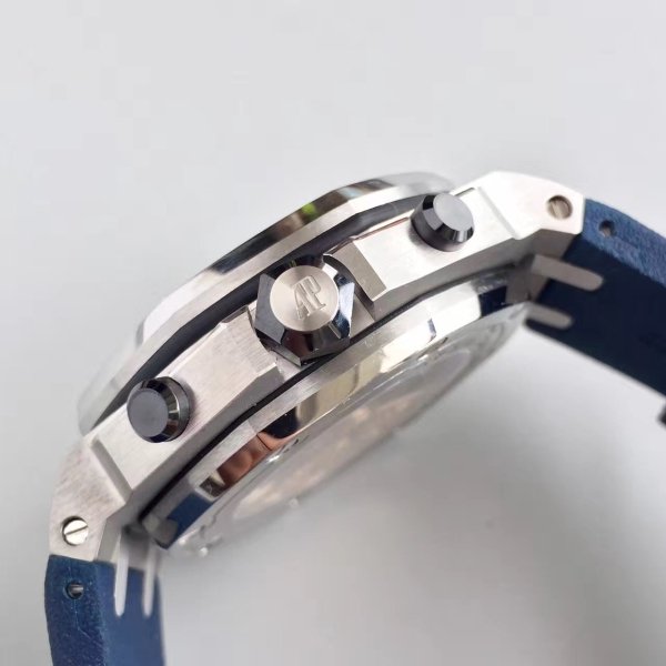 Синий, гильошированный (Mega Tapisserie). Часовые риски и стрелки Royal Oak, покрытые люминесцентным составом Super Luminova C3. Циферблат малой секундной стрелки в отметке на 15.00 часов и малый циферблат хронографа в отметке на 21.00 часов. |