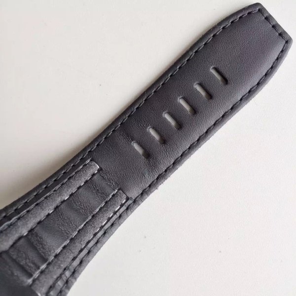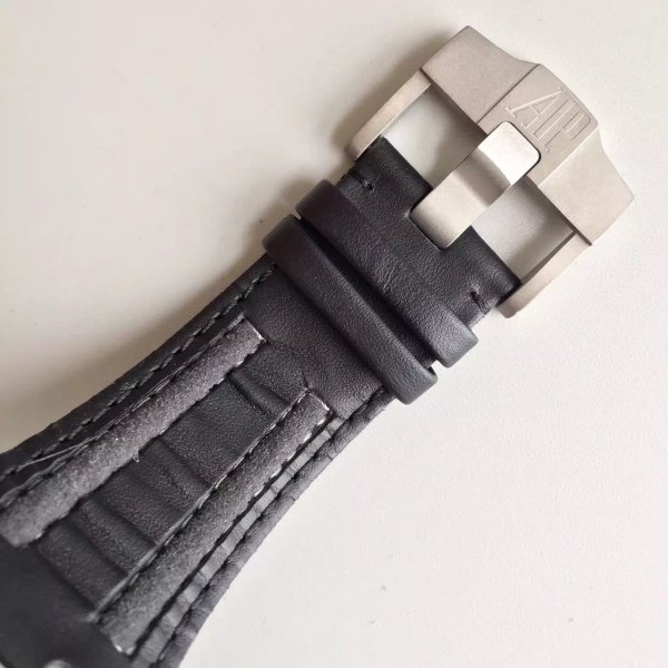 Черный, прошитый черными нитками, кожаный ремешок из толстой телячьей кожи, с продольными вставками и с простым (с помощью шипа) замком Audemars Piguet. |