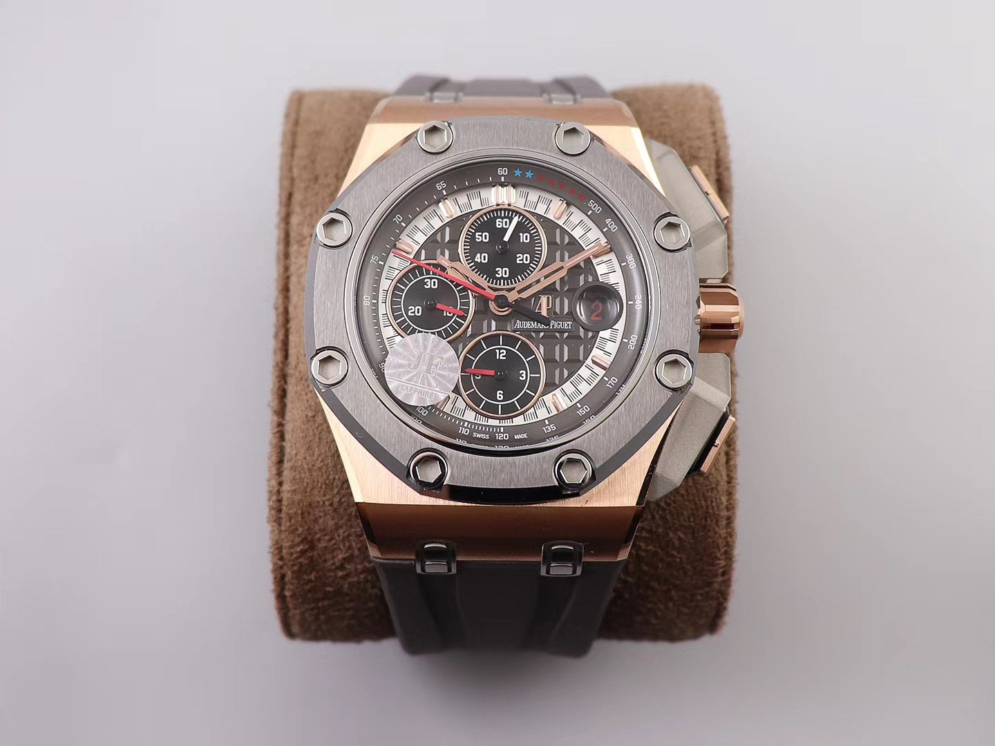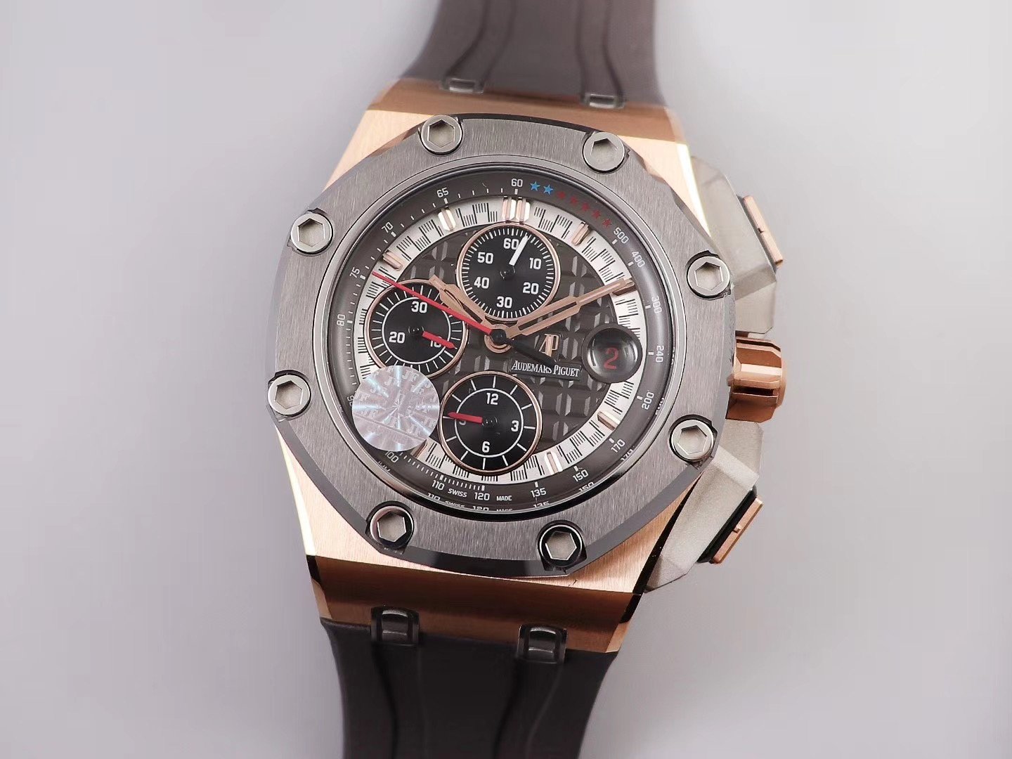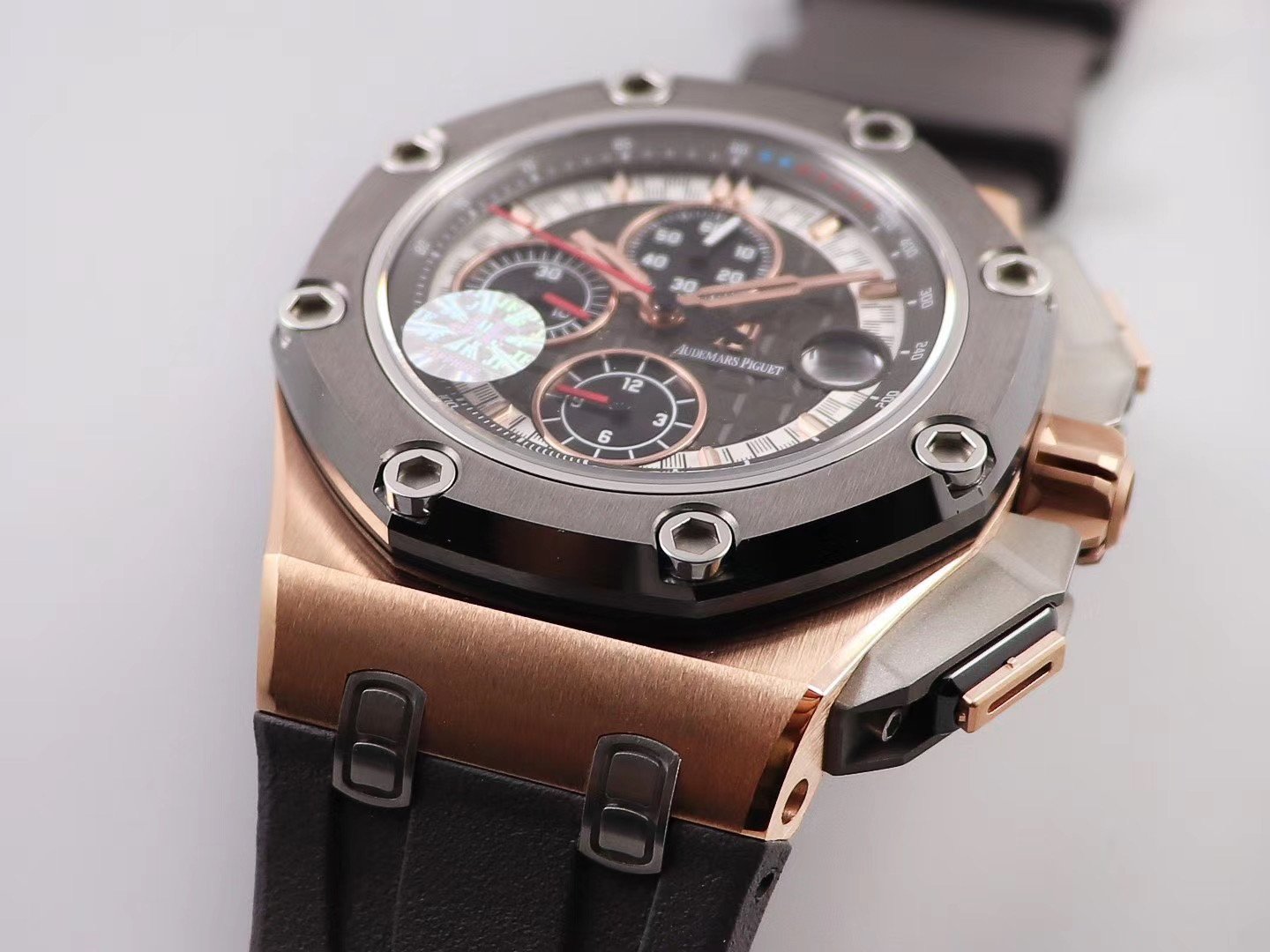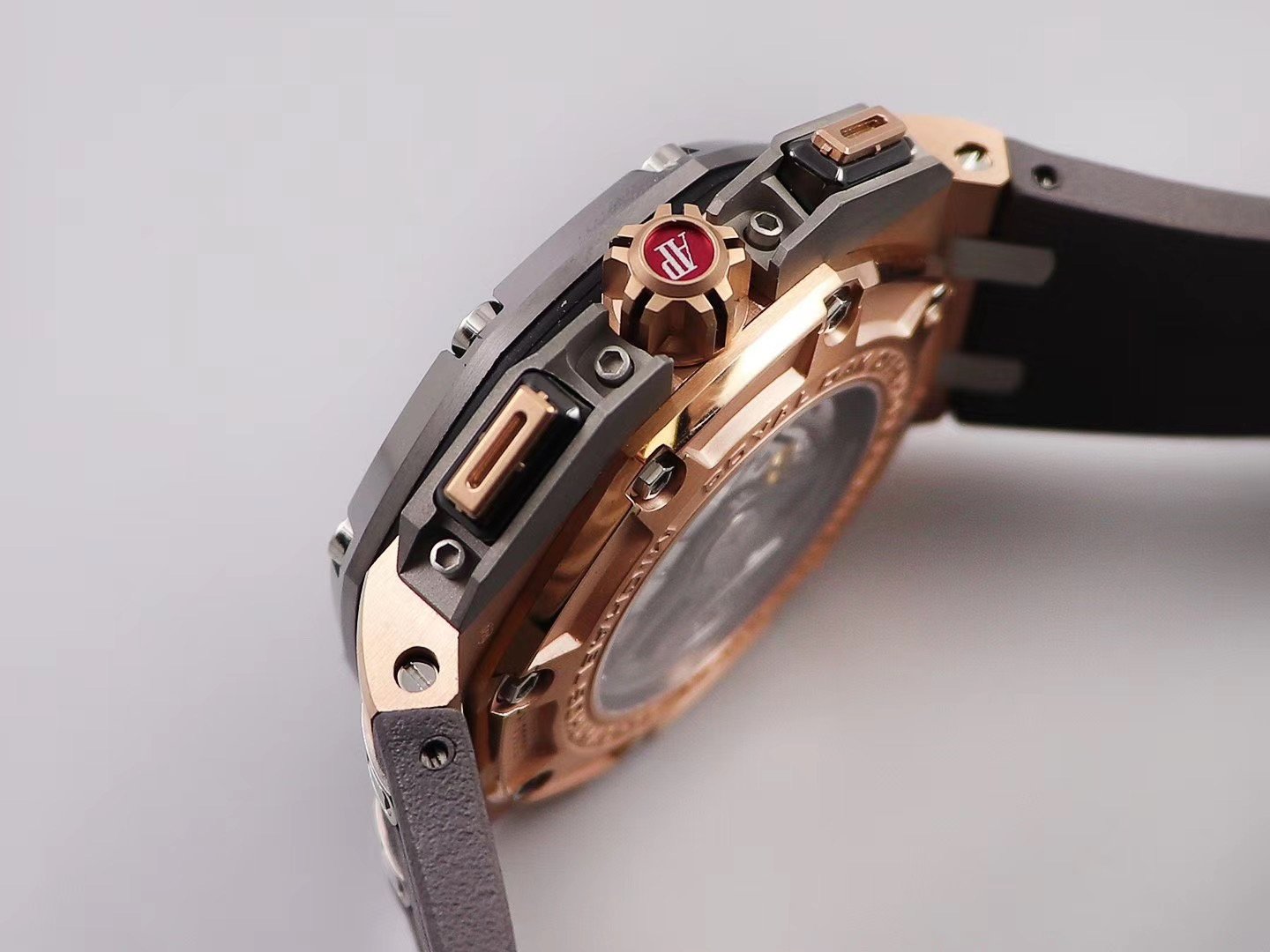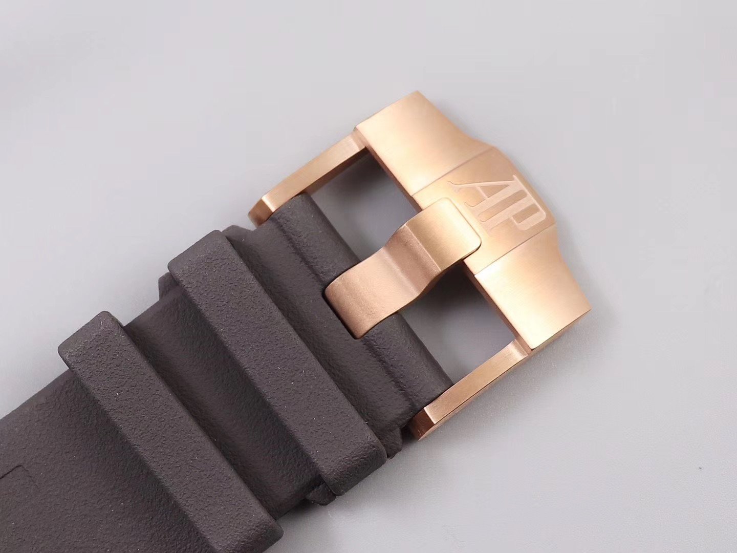 Серый каучуковый ремешок Royal Oak Offshore Michael Schumacher, с простым (с помощью шипа) позолоченным замком Audemars Piguet и указанием маркировки пробы золота. |