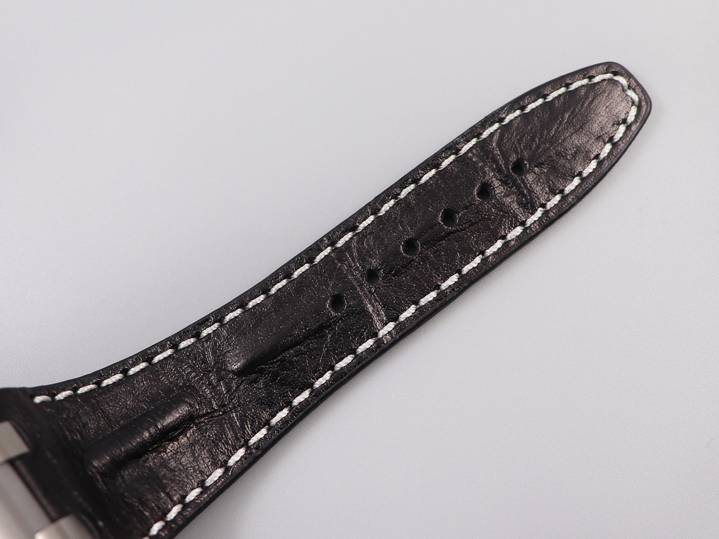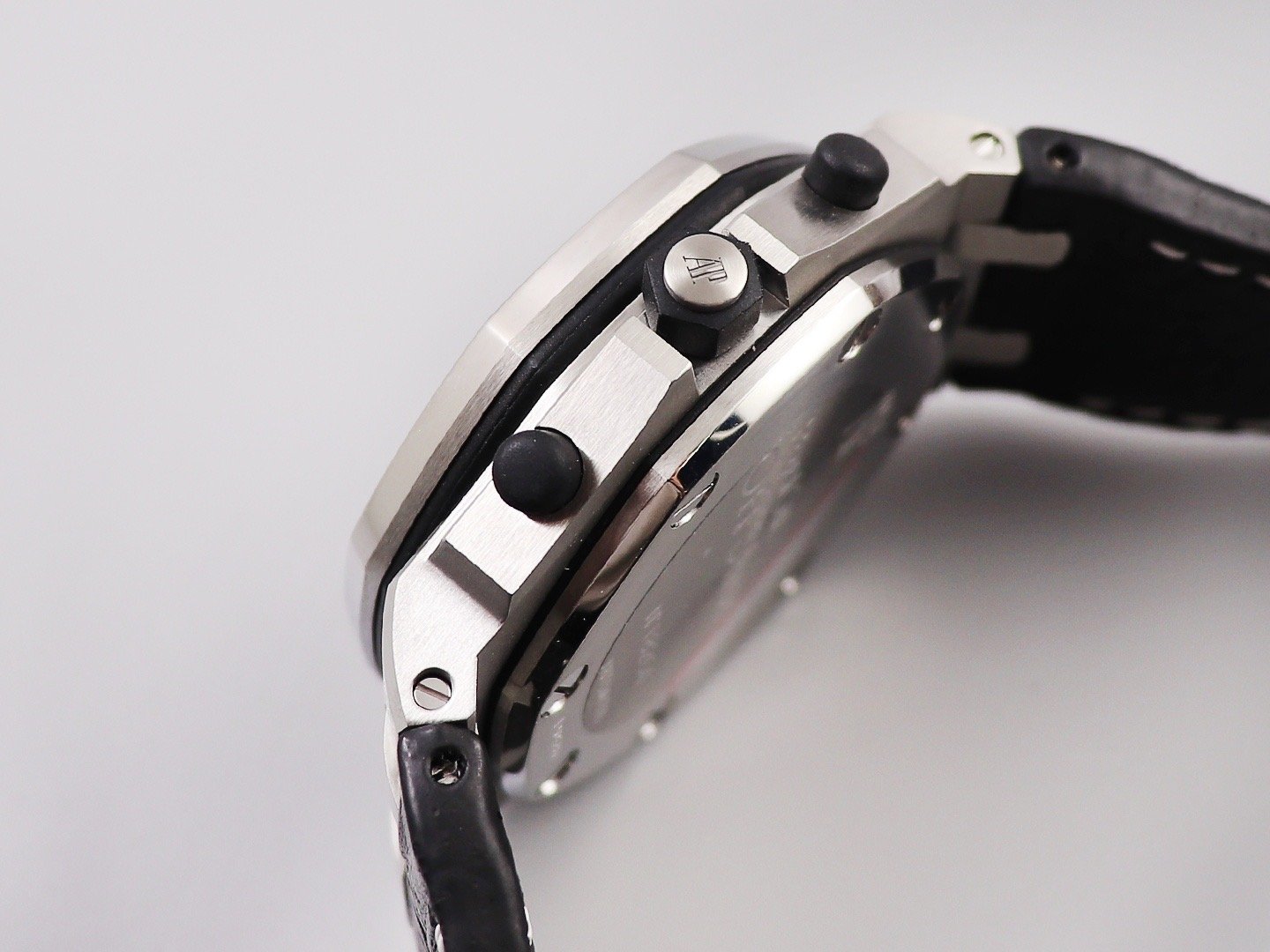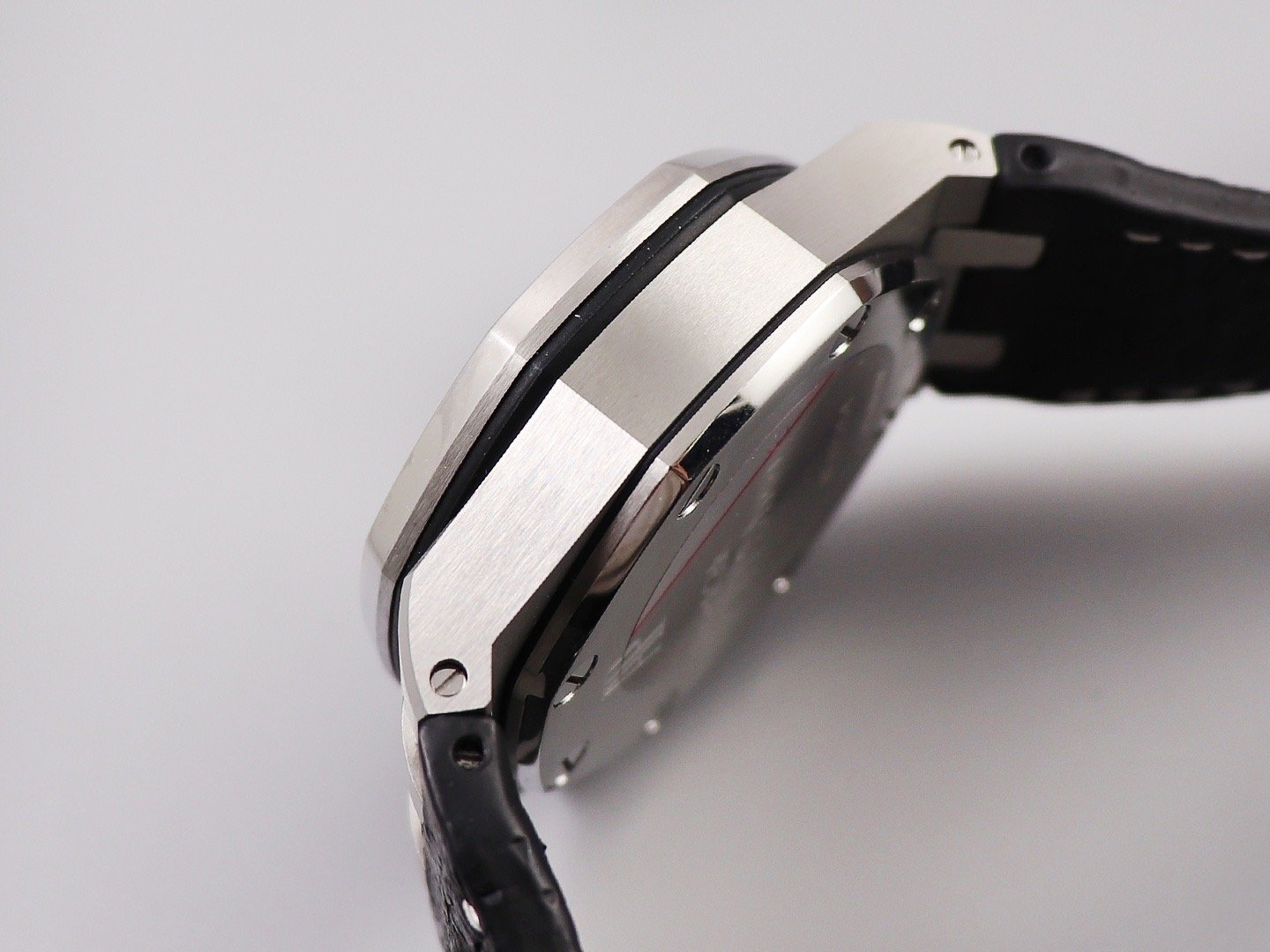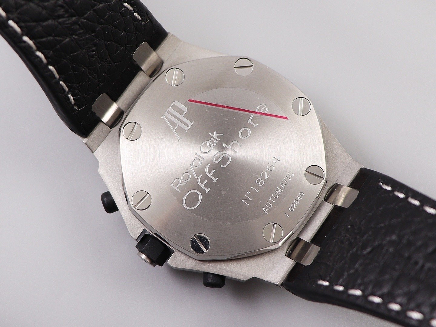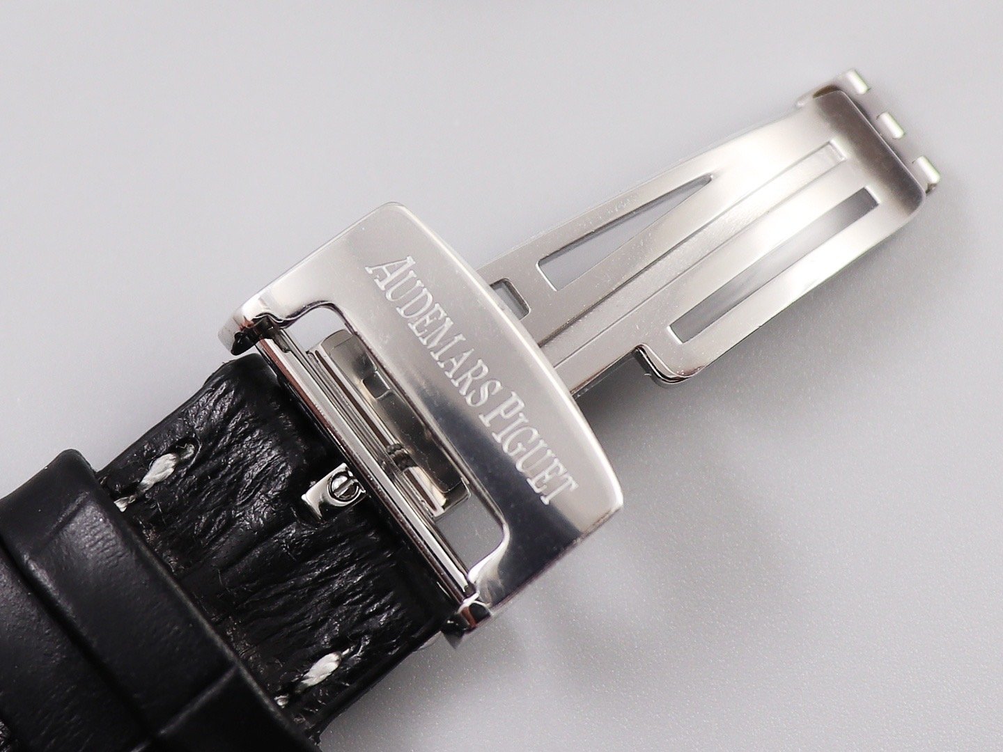 Черный кожаный ремешок, прошитый красными нитками, с простым (с помощью шипа) стальным сатинированным замком Audemars Piguet. Или черный каучуковый ремешок образца 2014 года. |
