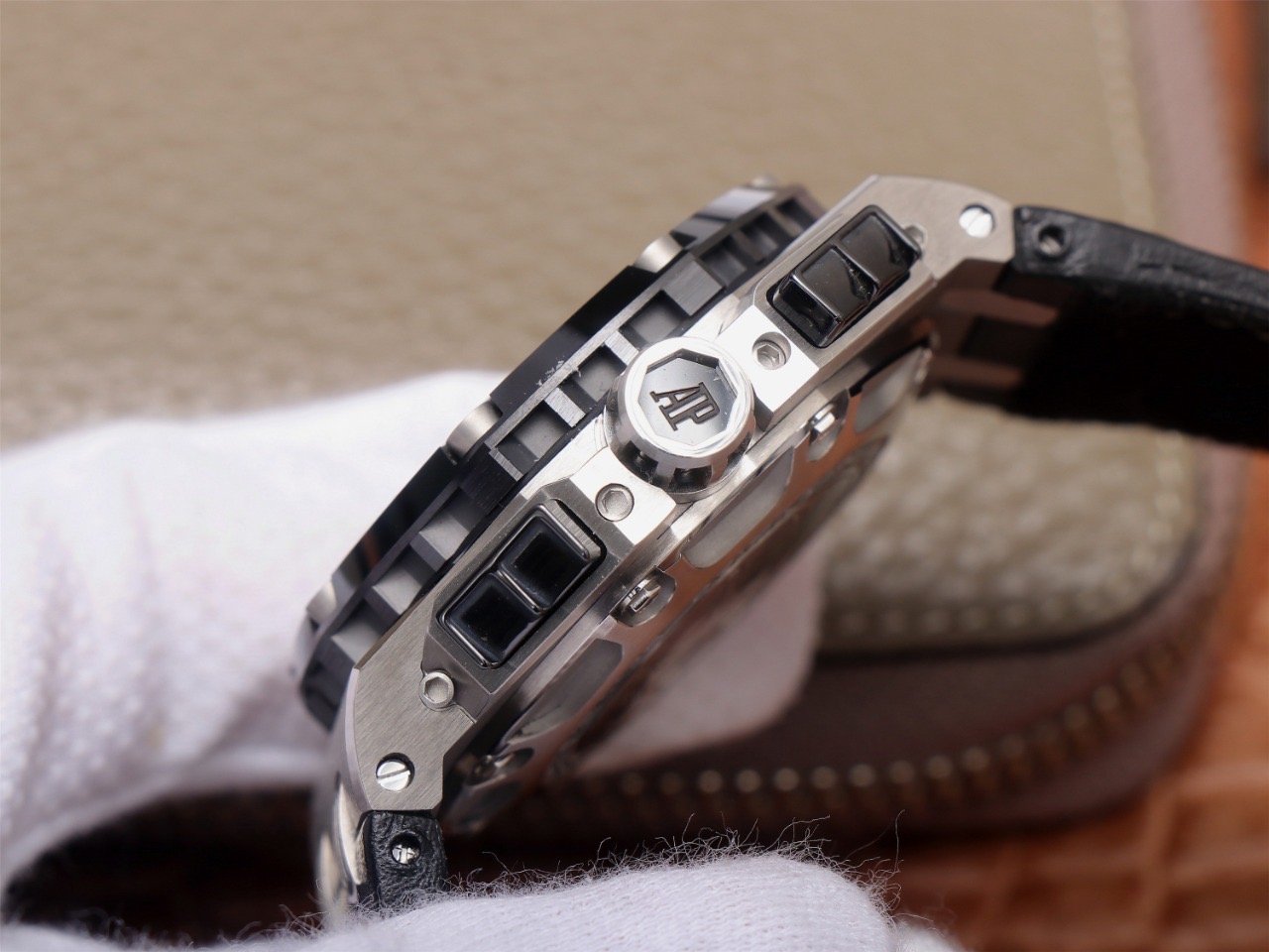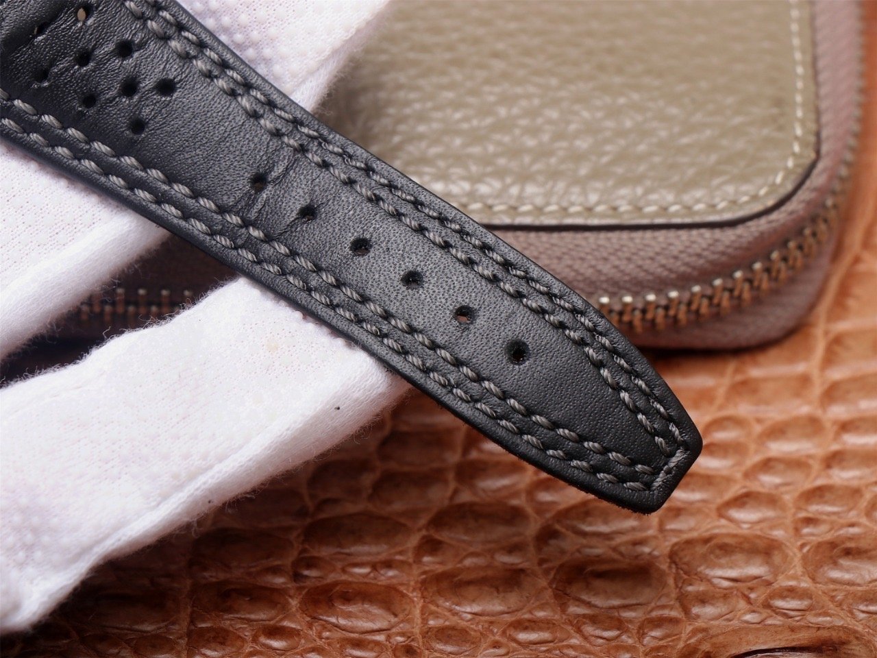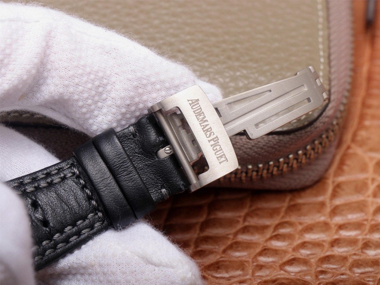 Черный, прошитый двойной строчкой белыми нитками, кожаный ремешок из толстой телячьей кожи, с двойной раскладывающейся титановой застежкой Audemars Piguet. |