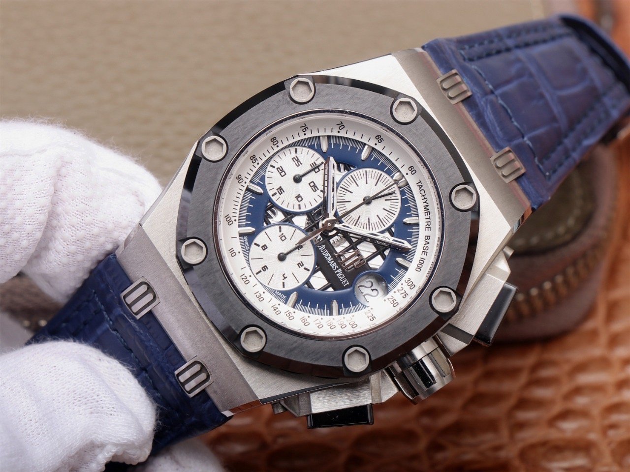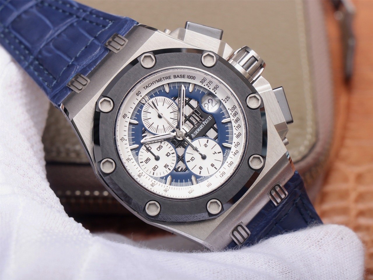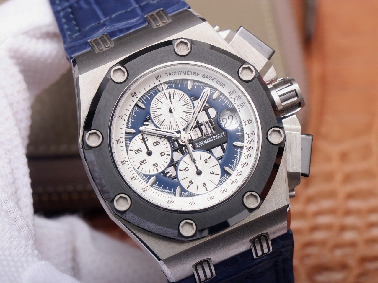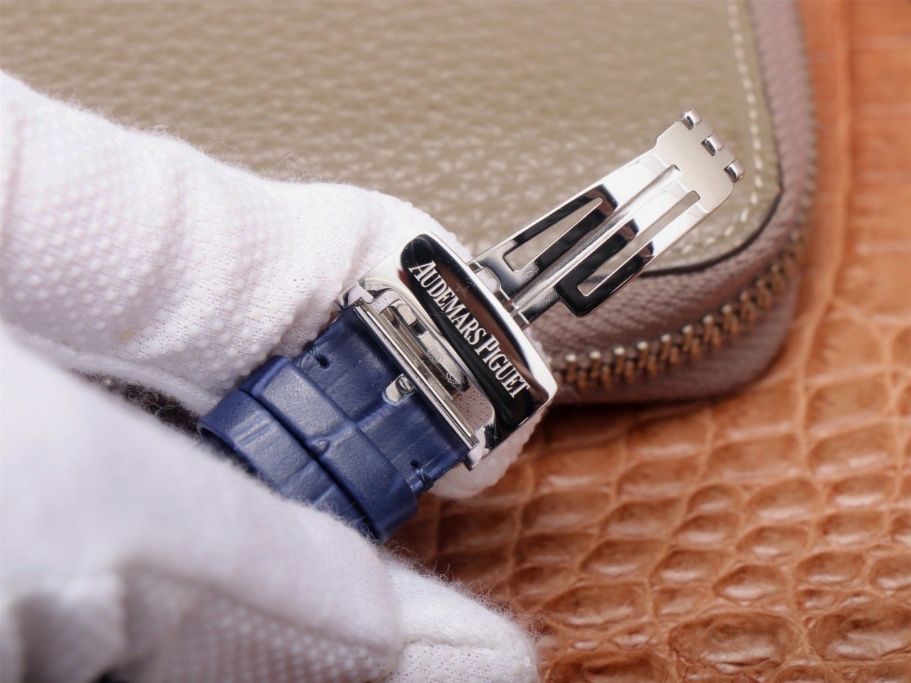 Синий, прошитый двойной строчкой черными нитками, кожаный ремешок из толстой телячьей кожи, с двойной раскладывающейся застежкой Audemars Piguet. |