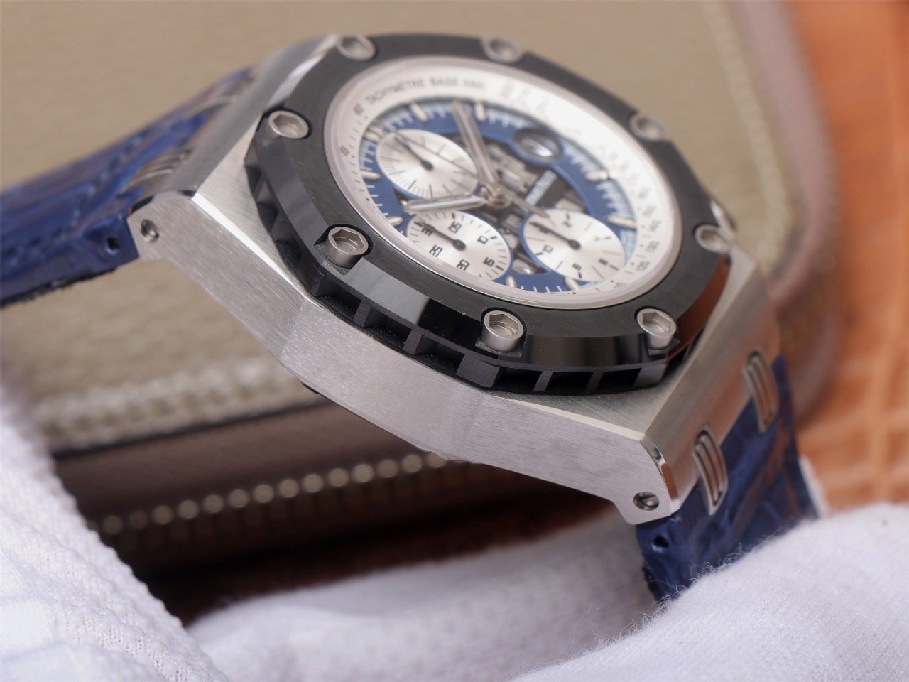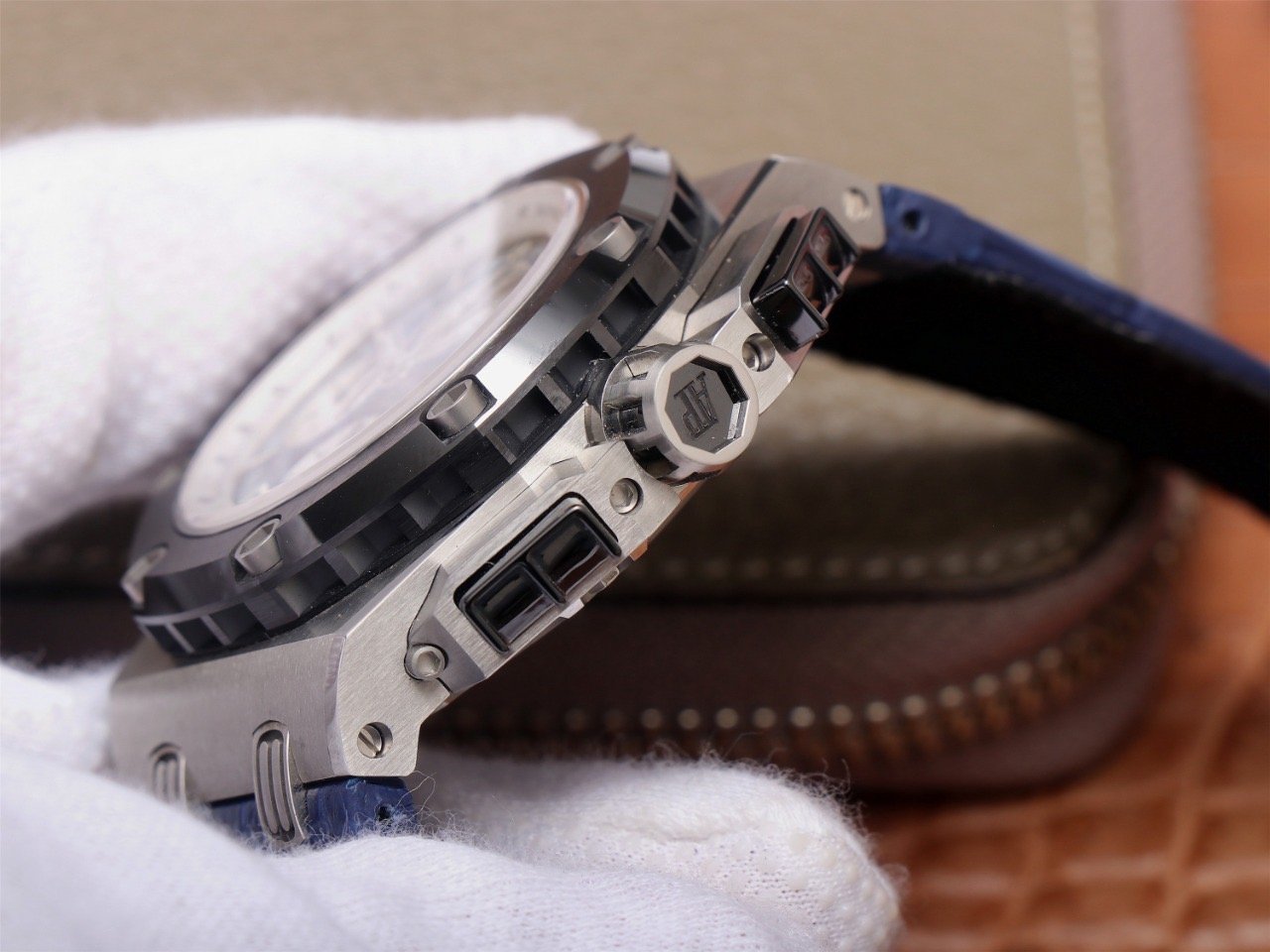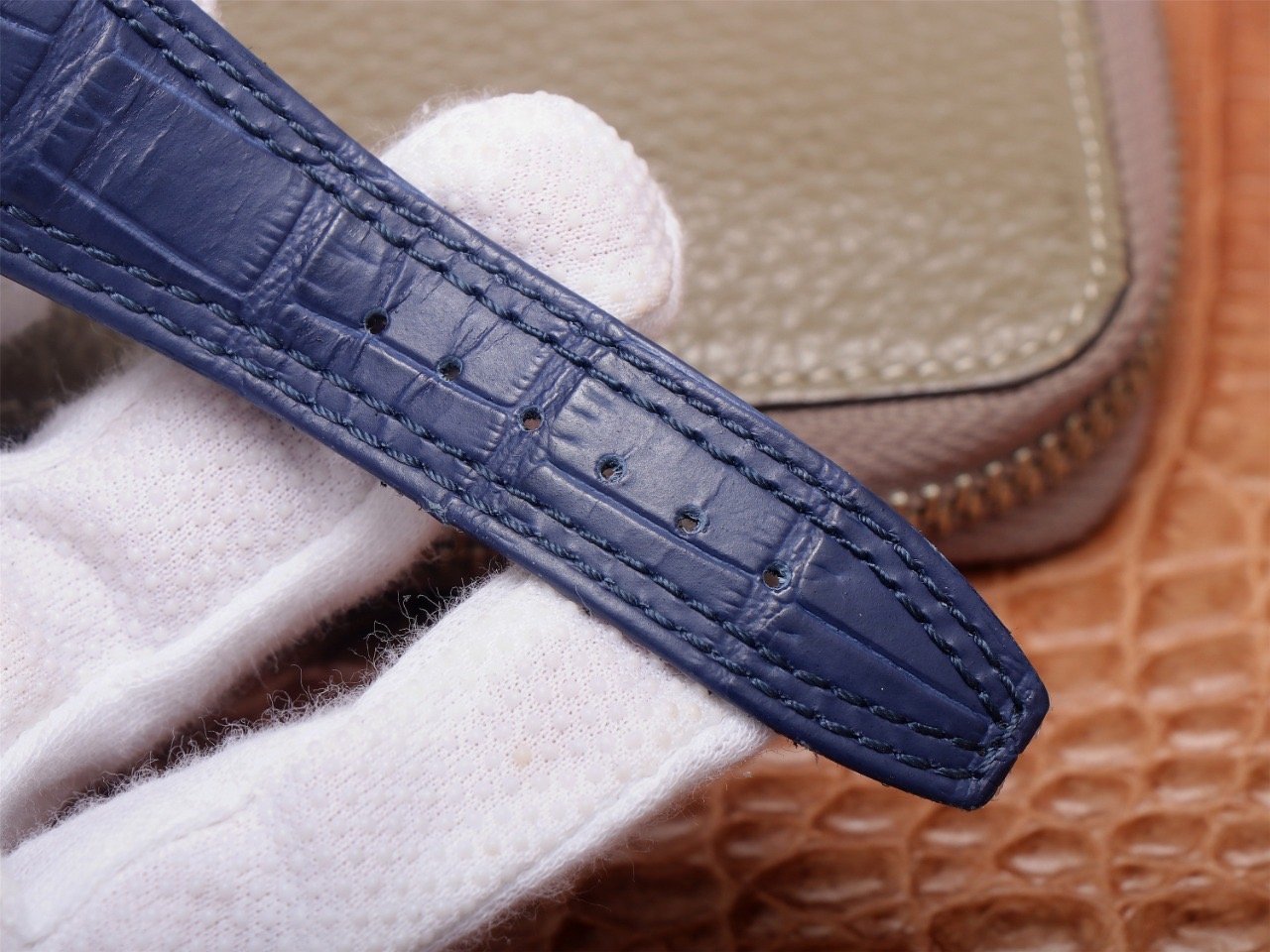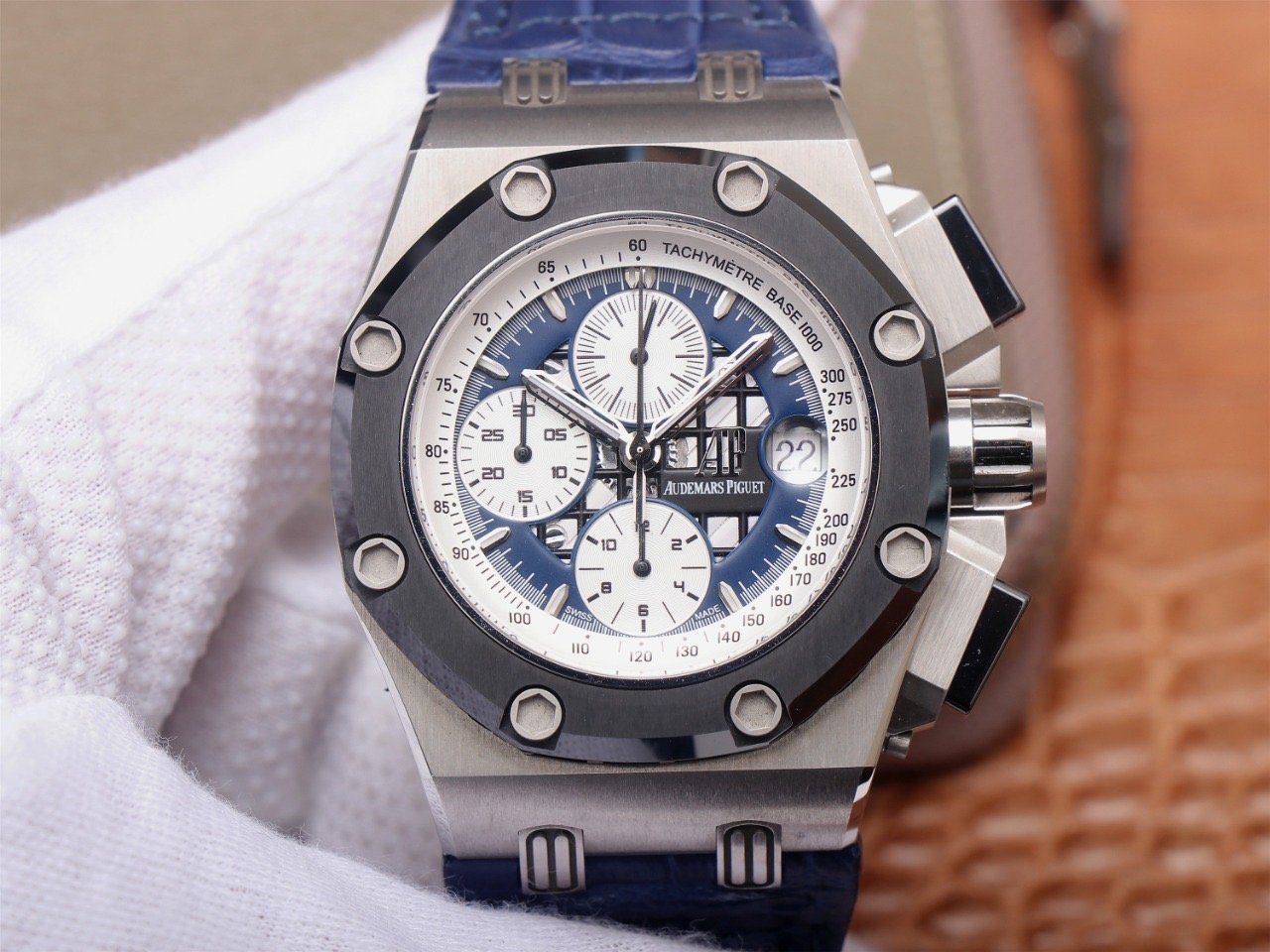 Синий, прошитый двойной строчкой черными нитками, кожаный ремешок из толстой телячьей кожи, с двойной раскладывающейся застежкой Audemars Piguet. |