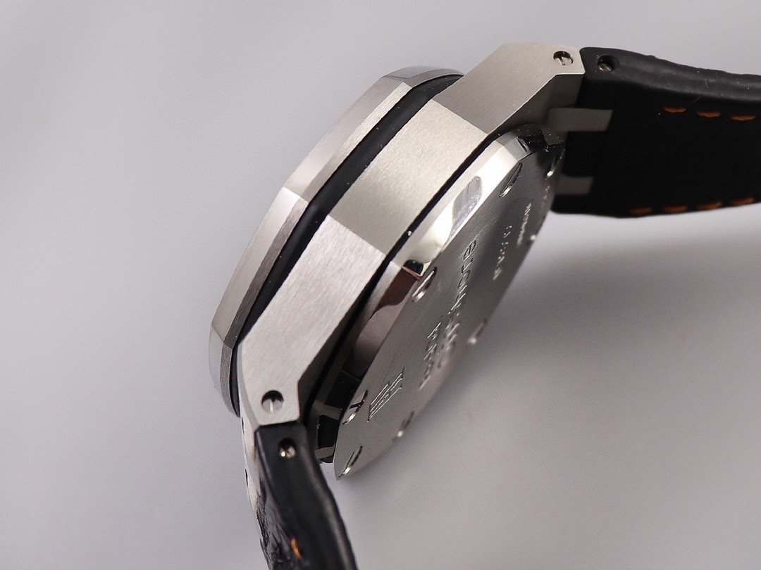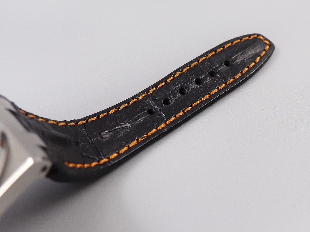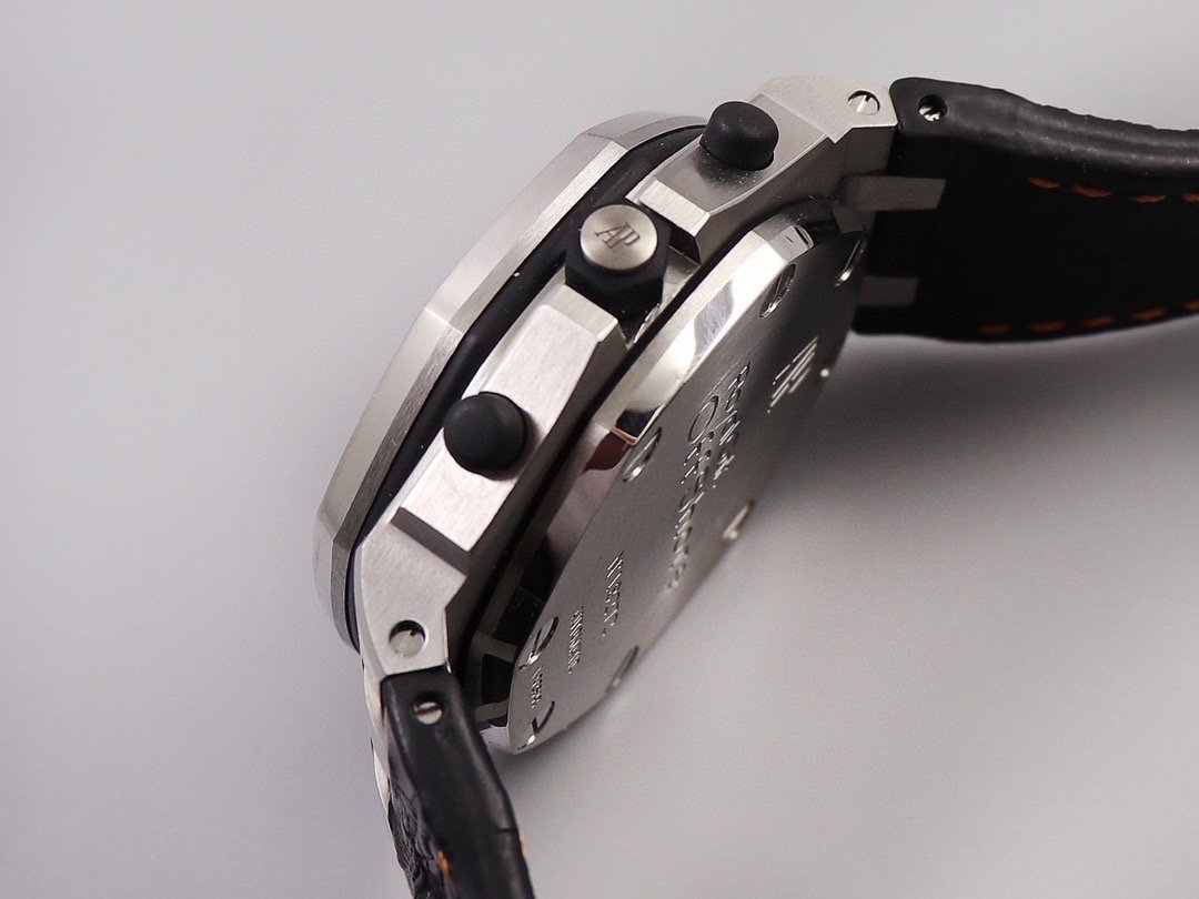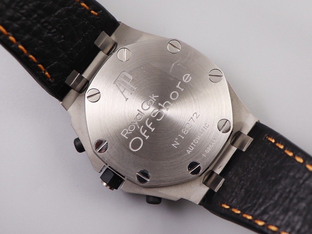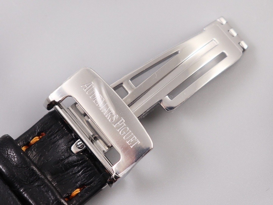 Черный кожаный ремешок, прошитый оранжевыми нитками, с простым (с помощью шипа) стальным сатинированным замком Audemars Piguet. Или черный каучуковый ремешок образца 2014 года. |