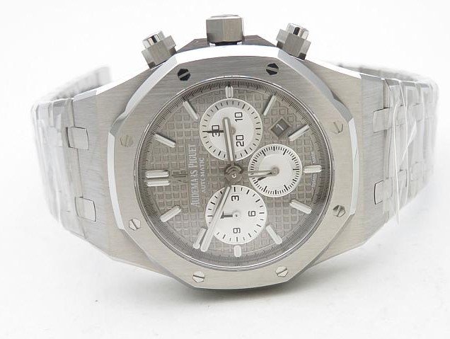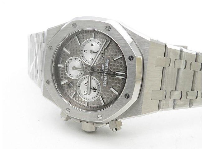 Серый, гильошированный. Часовые риски и стрелки Royal Oak, покрытые люминесцентным составом Super LumiNova С1 + С3. Малые циферблаты хронографа и циферблат малой секундной стрелки в отметке на 21.00 часов. Окно даты, в отметке на 16.30 часов |