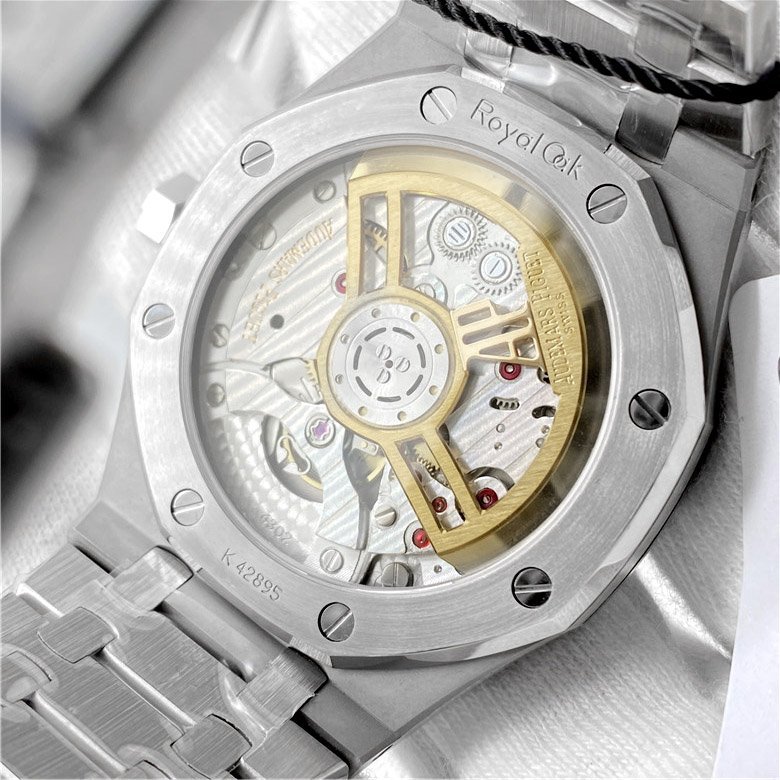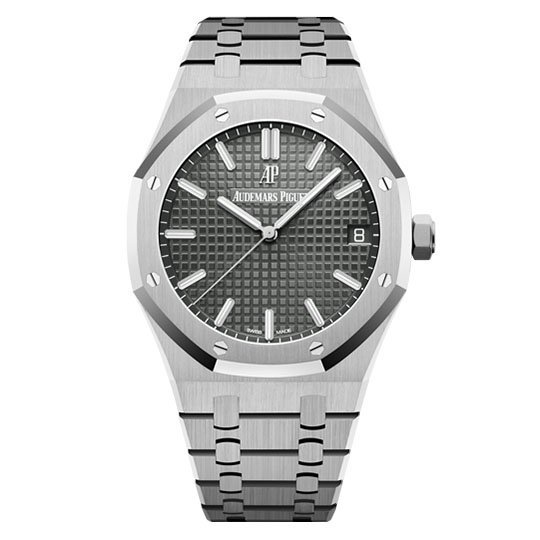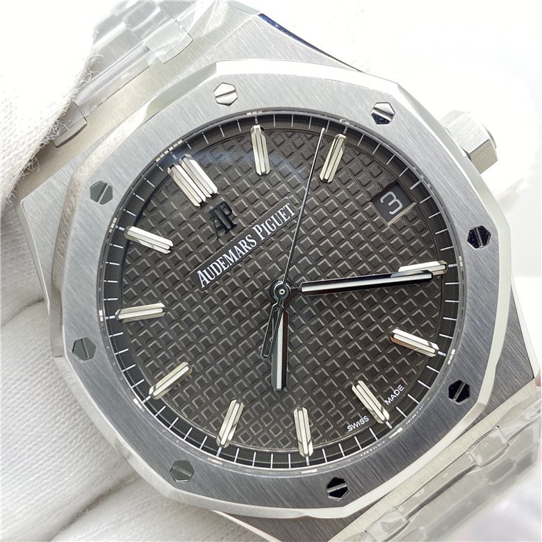 Серый, гильошированный (Mega Tapisserie). Часовые риски и стрелки Royal Oak, покрытые люминесцентным составом Super LumiNova С1 + С3. Окно даты, расположенное в отметке на 15.00 часов. |