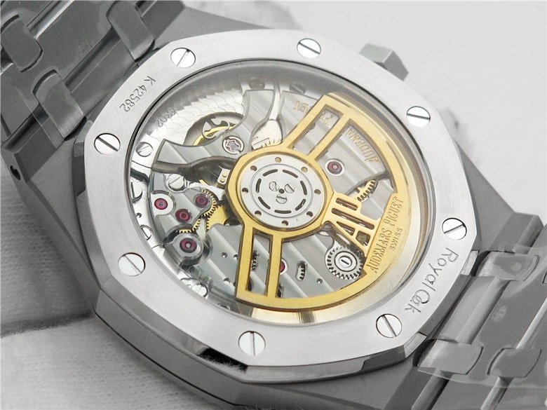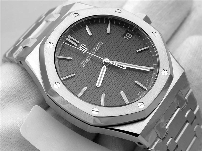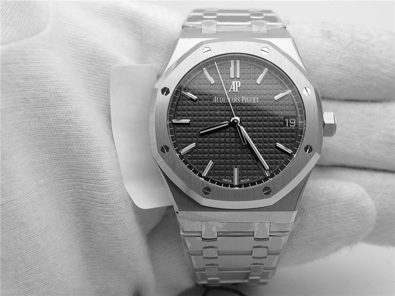 Черный, гильошированный (Mega Tapisserie). Часовые риски и стрелки Royal Oak, покрытые люминесцентным составом Super LumiNova С1 + С3. Окно даты, расположенное в отметке на 15.00 часов. |