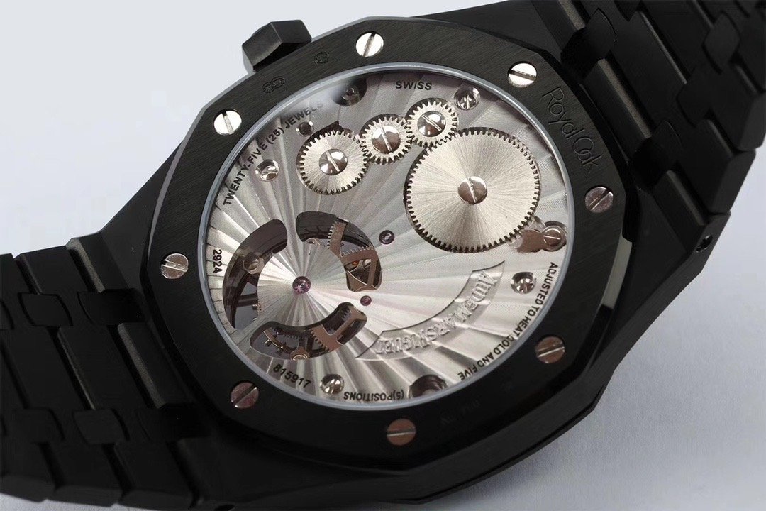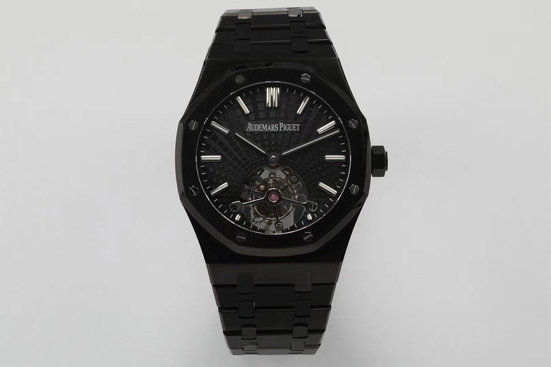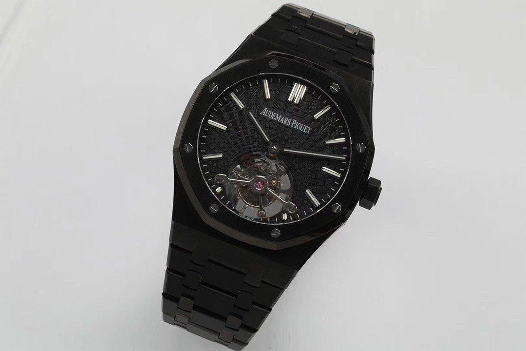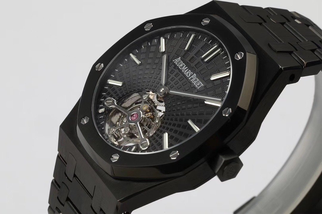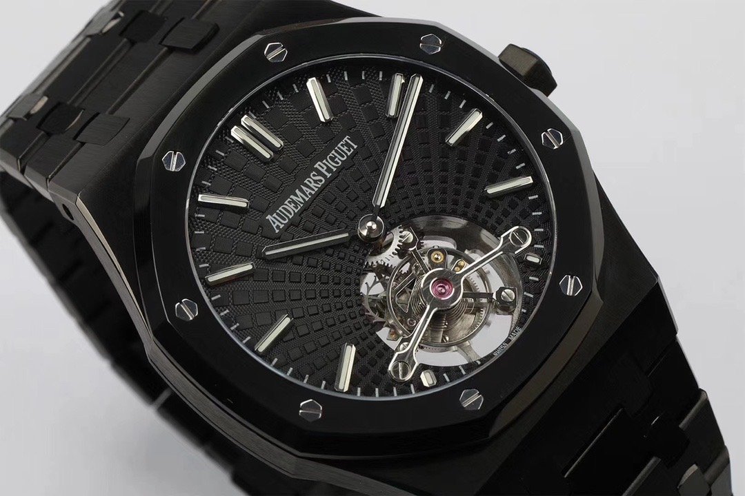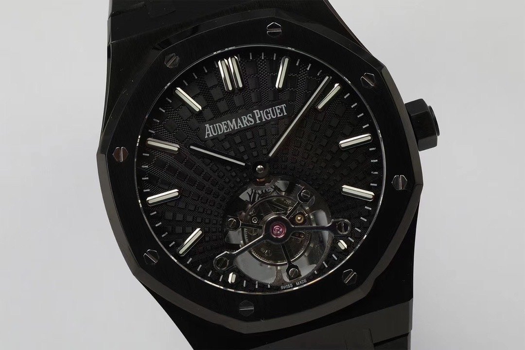 Чёрный, гильошированный (Tapisserie Evolutive). Часовые риски и стрелки Royal Oak, покрытые люминесцентным составом Super LumiNova С3. Декорированная, ось одноминутного парящего турбийона, расположенного в отметке на 18.00 часов. |