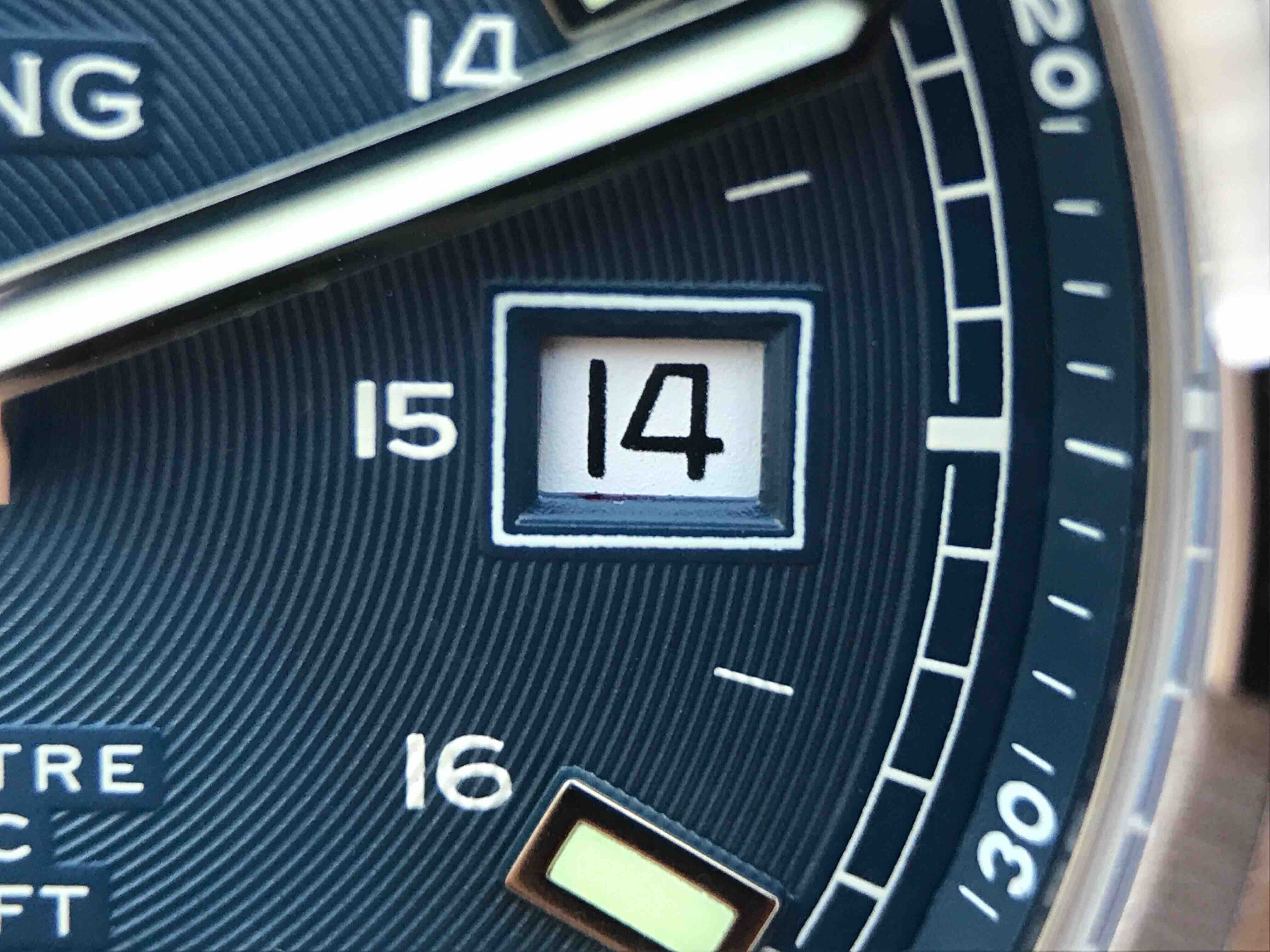 Синий, с круговым гильошированием по всему радиусу. Полированные часовые риски и стрелки, покрытые люминесцентным составом Super LumiNova С1. Окно даты, расположенное в отметке на 15.00 часов. |