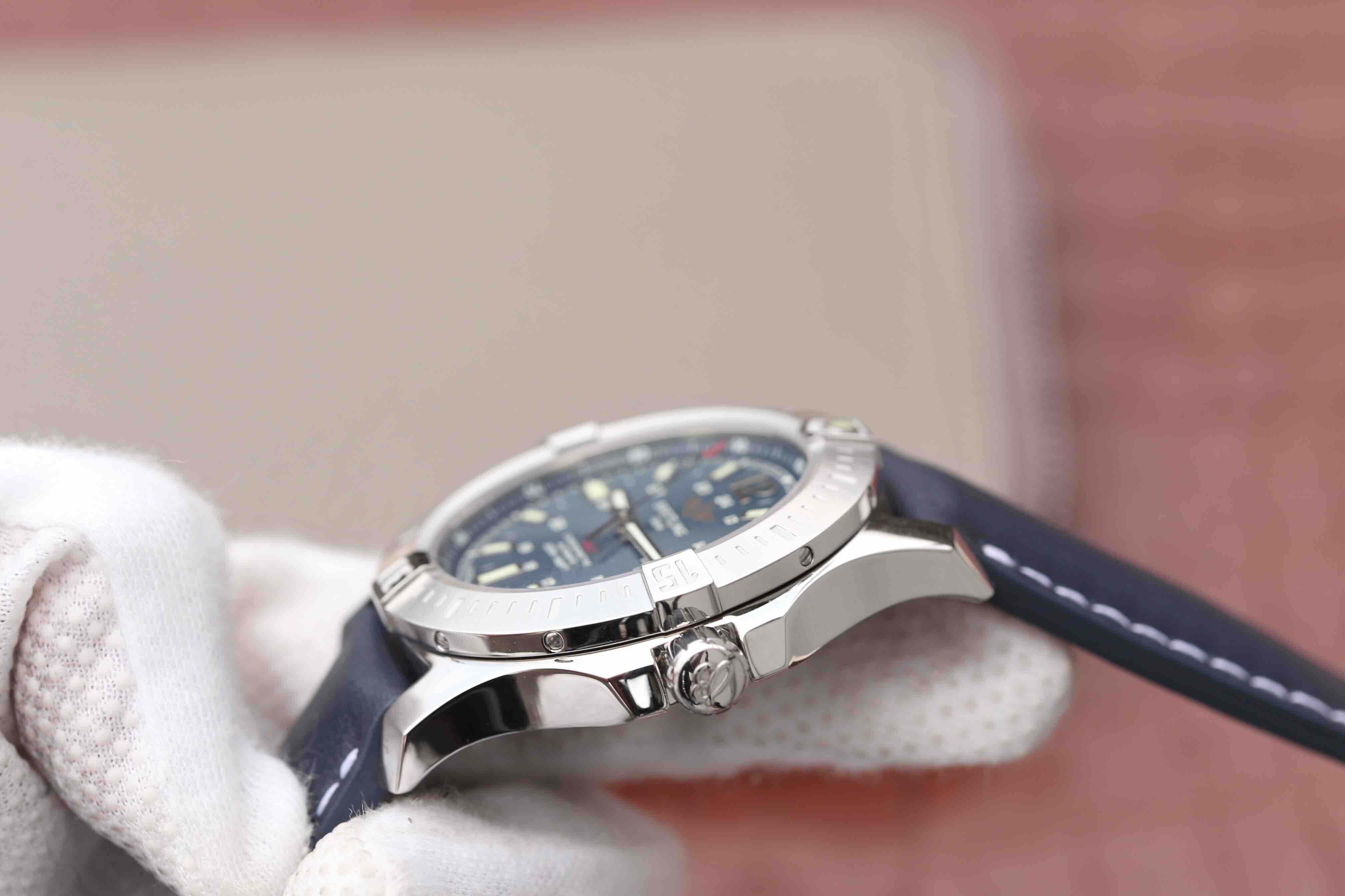 Синий кожаный ремешок, с простым (с помощью шипа) замком Breitling. Либо стальной браслет из сатинированной стали Professional III. |