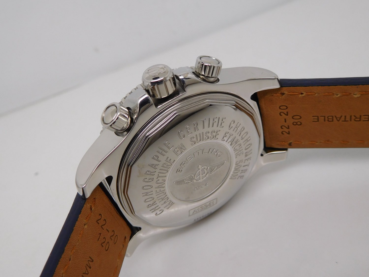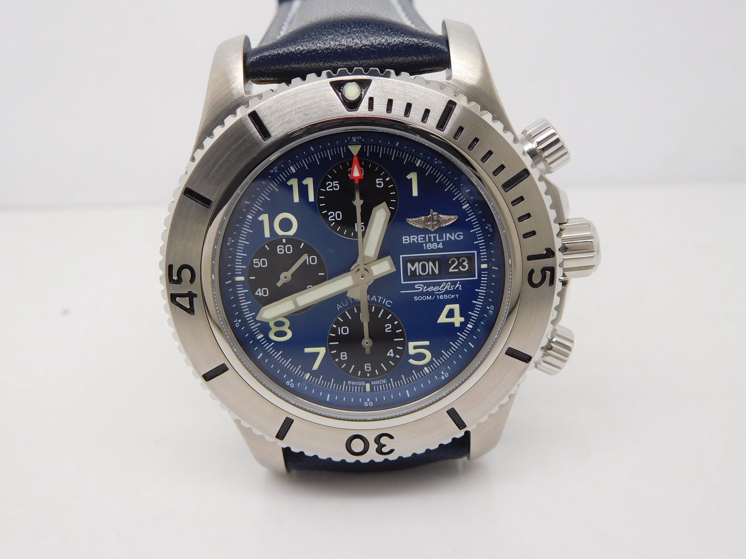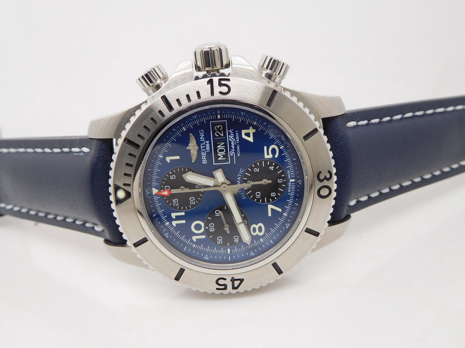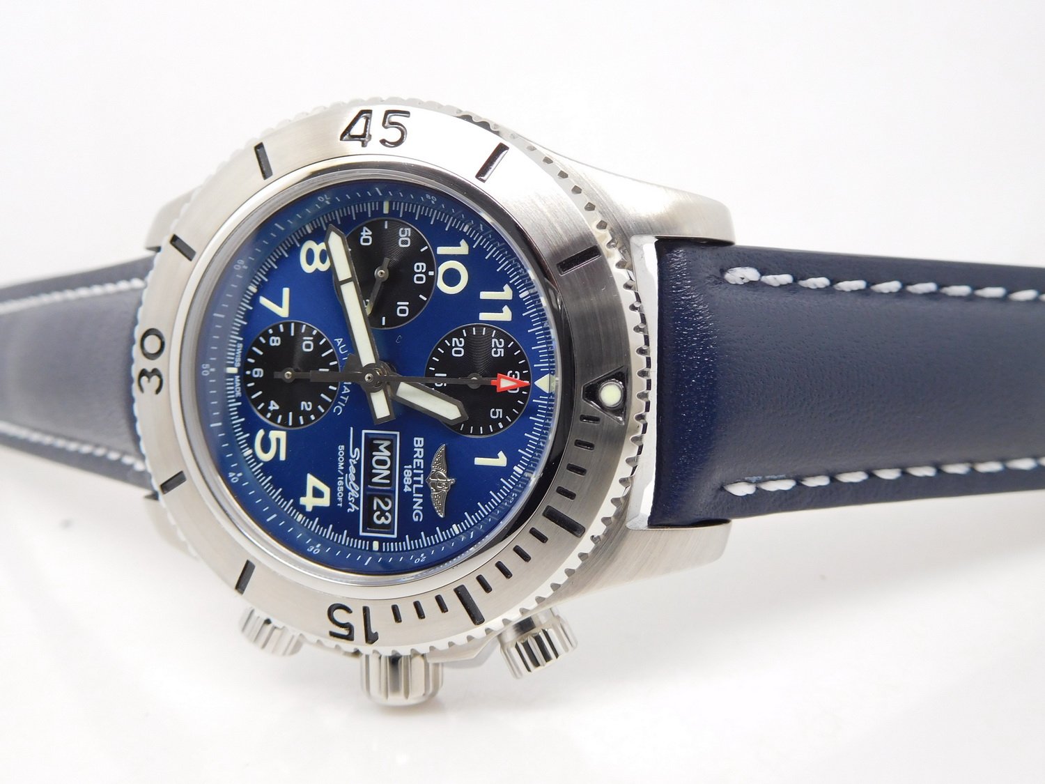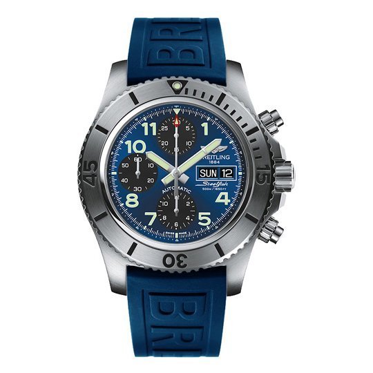 Оригинальный синий каучуковый ремешок SuperOcean, с простым (с помощью шипа) замком Breitling. |