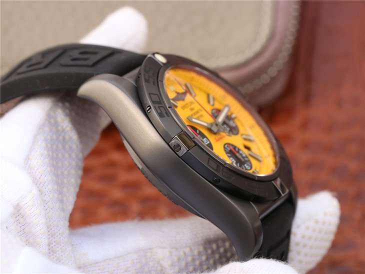 Желтый, черные малые циферблаты. Часовые метки и полированные, мечевидные стрелки, покрытые люминесцентным составом. Счетчики хронографа и малой секундной стрелки. Окно даты, расположенное в отметке на 16.30 часов |