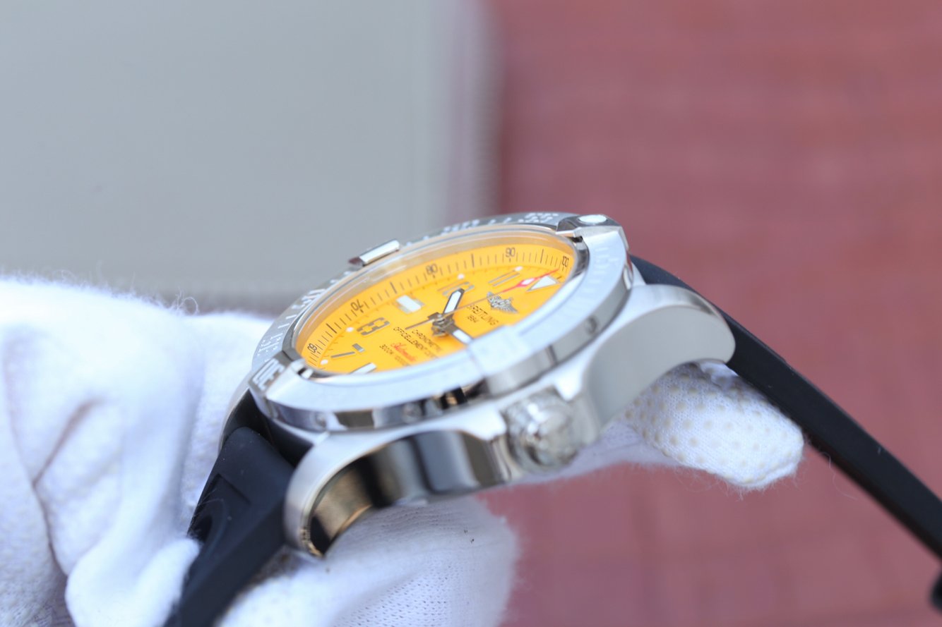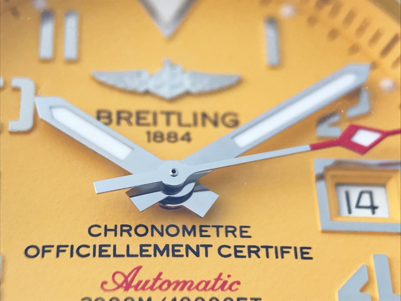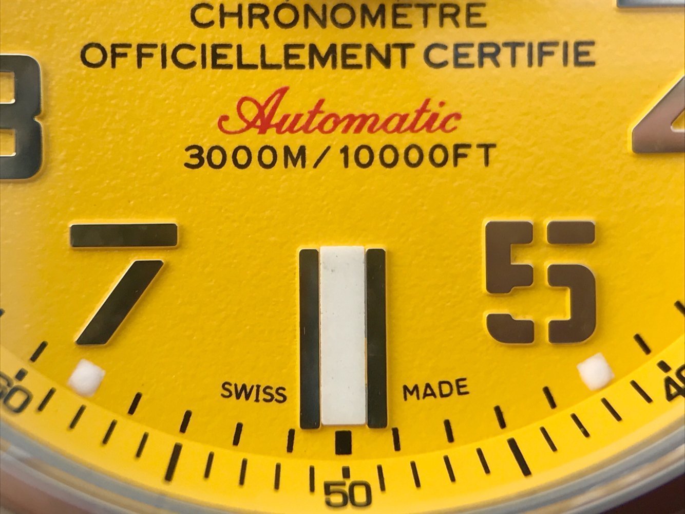 Желтый, черные малые циферблаты. Часовые метки и полированные, мечевидные стрелки, покрытые люминесцентным составом. Счетчики хронографа и малой секундной стрелки. Окно даты, расположенное в отметке на 16.30 часов |