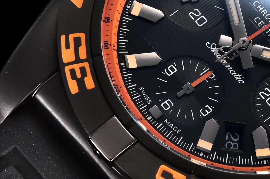 Черный, черные малые циферблаты. Часовые метки и полированные, мечевидные стрелки, покрытые люминесцентным составом. Счетчики хронографа и малой секундной стрелки. Окно даты, расположенное в отметке на 16.30 часов |