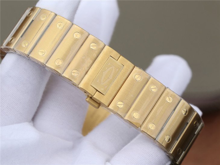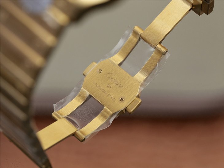 Позолоченный браслет из сатинированной стали нового образца, с системой быстрого укорачивая SmartLinks, с двойной раскладывающейся застежкой Cartier. Либо кожаный ремешок, с двойной раскладывающейся застежкой Cartier. Система быстрой смены браслета. |