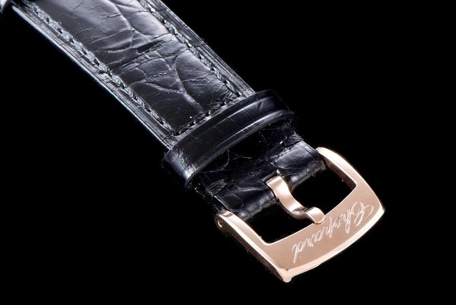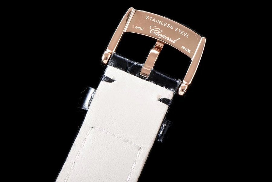 Чёрный (синий, красный, коричневый) кожаный ремешок, с простым (с помощью шипа) позолоченным замком Chopard. |