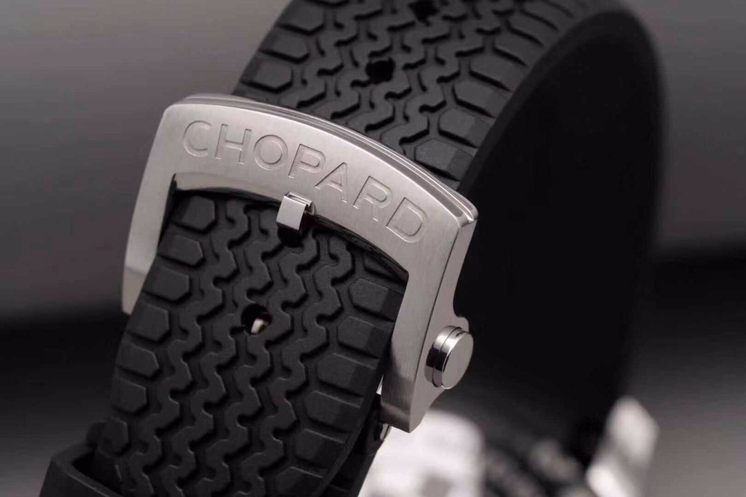 Черный каучуковый ремешок с имитацией протекторных шин, крепится раскладывающейся стальной застежкой |