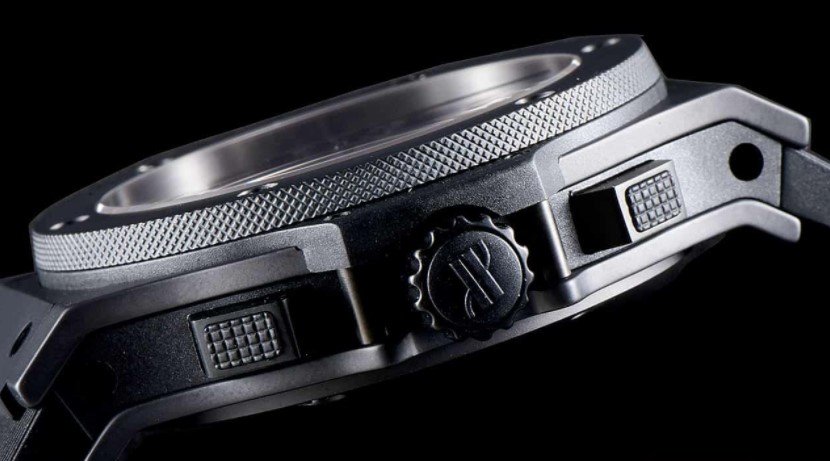 Фиксированный в одном положении 6 Н-образными титановыми винтами, керамический матовый черный безель. |