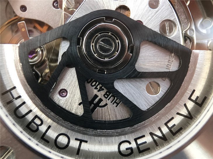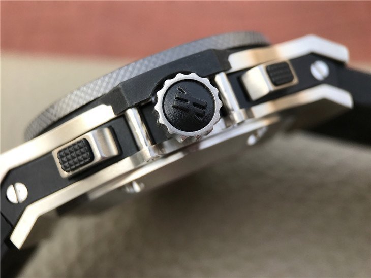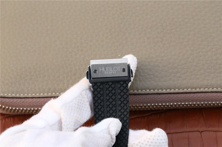 Чёрный каучуковый ремешок, с двойной раскладывающейся стальной застежкой Hublot, состоящей из нескольких частей. |